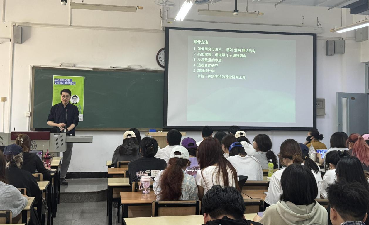 交流會前,學院領導們與陳慰平教授就藝術學院與央美設計學院的教學培養模式展開深入交流。交流會中,陳教授以“信息設計:Mapping地圖&制圖”和“傳統文字動態創新設計” 兩門課程為核心,結合學生案例闡釋了文字與信息編排設計的路徑是從“選題、分析、研究”再到“描摹、提煉、仿寫、系統化、規范化”再到“動態、交互、生成”,學生通過動態文字設計可能性的采索,對傳統文字和文化進行“再發現”的設計流程,強調了動態圖形與交互設計融合的重要性。