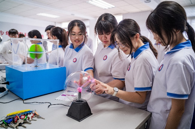 在理學院青少年創客科普基地的物理科普研學活動中,王丹麗老師帶領學生們,通過智能機器人靈活的動作、精準的語音交互,以及基于人工智能算法完成的復雜任務,直觀理解物理學在智能器件與能源開發中的底層邏輯。現場設置的“電磁阻尼”“聽話的小球”等互動實驗,直觀呈現了能量轉化過程,不僅生動詮釋了許多物理現象的奧秘,還讓參與者親身體會基礎科學與綠色生活的緊密關聯。
