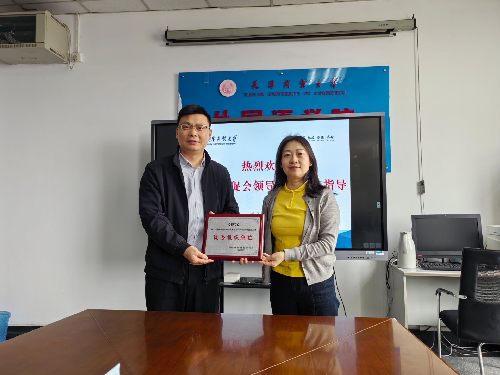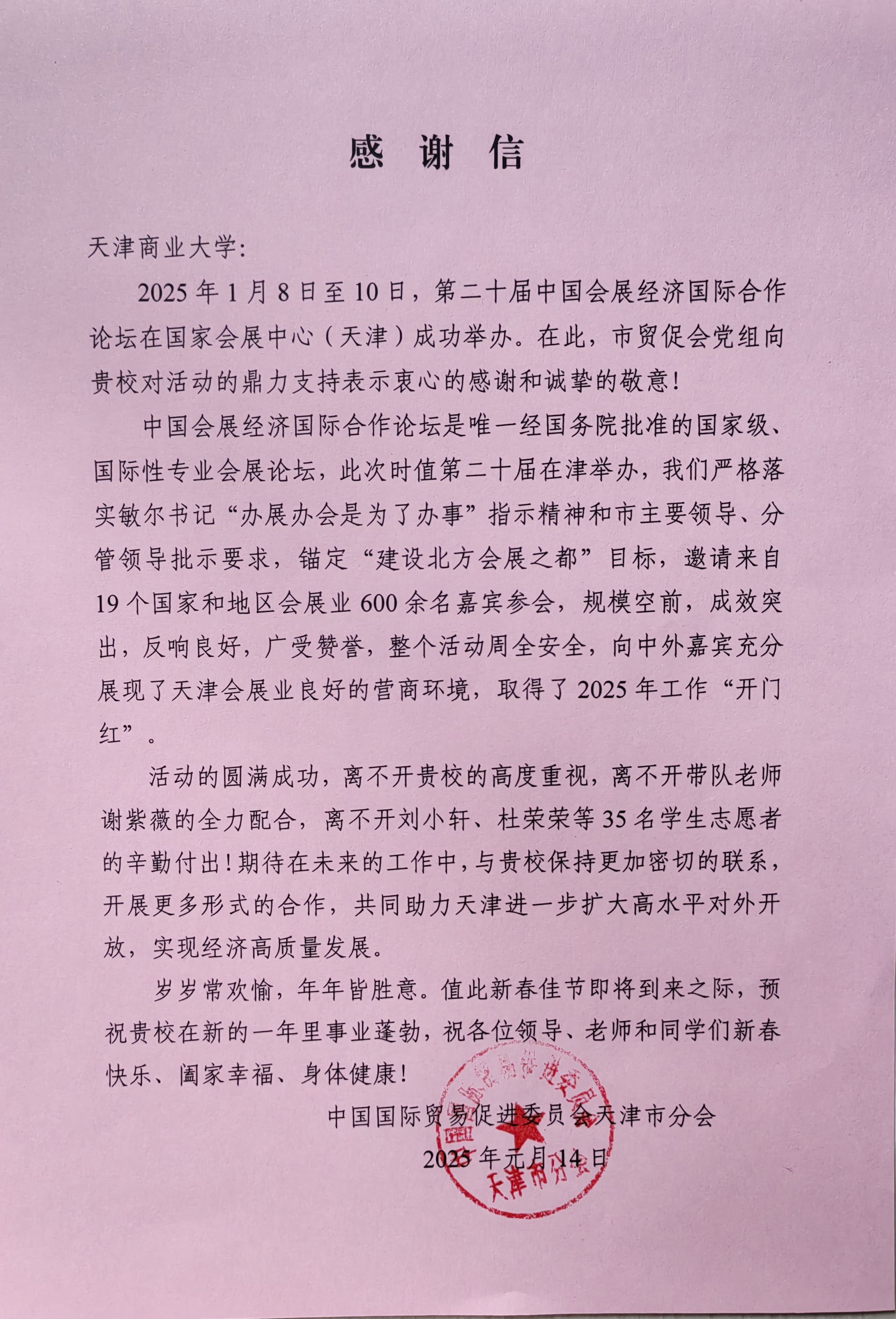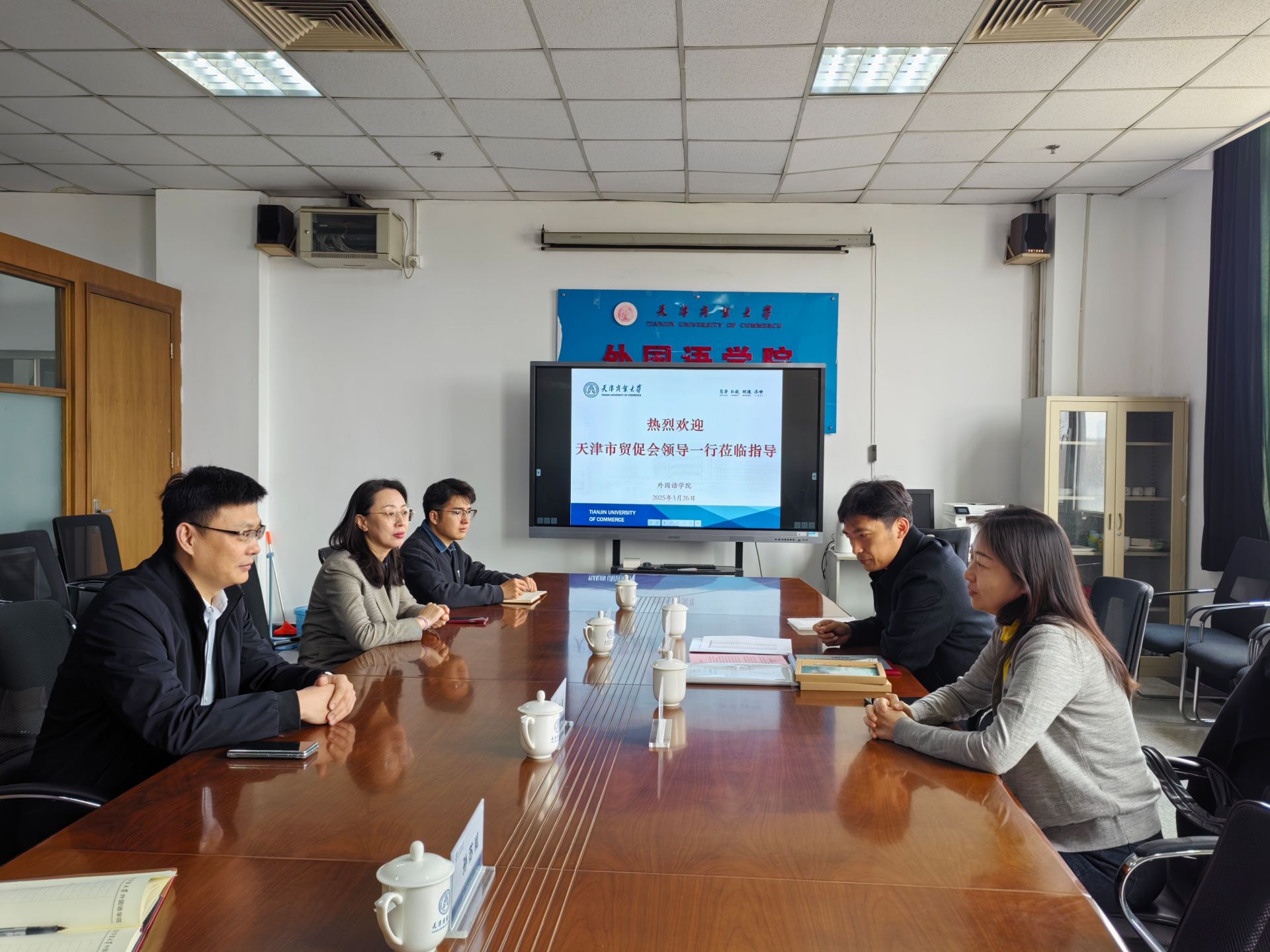 3月26日,中國(guó)國(guó)際貿(mào)易促進(jìn)委員會(huì)天津市分會(huì)商法中心主任蔡穎一行到訪我校,就學(xué)校35名學(xué)生在第二十屆中國(guó)會(huì)展經(jīng)濟(jì)國(guó)際合作論壇提供的高質(zhì)量志愿服務(wù),表達(dá)誠(chéng)摯謝意,并發(fā)來(lái)感謝信。外國(guó)語(yǔ)學(xué)院黨委書(shū)記劉桂濤、黨委副書(shū)記孟凡榮及相關(guān)教師出席會(huì)議,雙方圍繞志愿服務(wù)、人才培養(yǎng)等議題展開(kāi)深入探討。