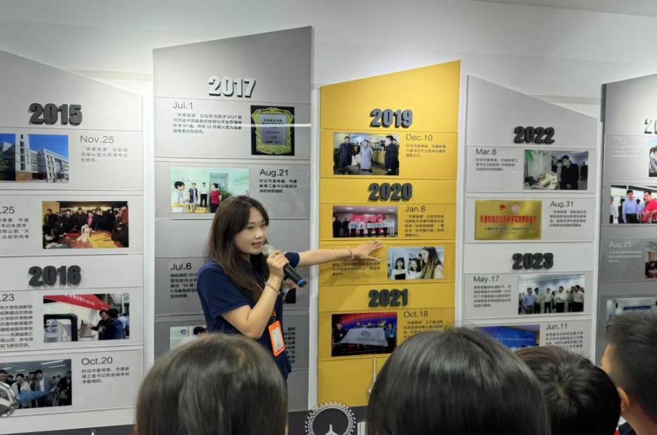 師生研學(xué)團(tuán)走進(jìn)“天商微渡”眾創(chuàng)空間,非遺手作、文創(chuàng)產(chǎn)品、3D打印技術(shù)等項(xiàng)目,沉浸式雙創(chuàng)場(chǎng)景打破傳統(tǒng)課堂邊界,點(diǎn)燃青少年的科創(chuàng)熱情。步入天津市黨的建設(shè)與黨史故事思政課重點(diǎn)實(shí)驗(yàn)室,一幅幅生動(dòng)的黨史圖片、一件件珍貴的黨史文物、一個(gè)個(gè)激昂的黨史故事,將黨的光輝歷程和偉大成就生動(dòng)展現(xiàn),小朋友們?cè)诟形蚣t色力量中厚植家國(guó)情懷。天津商業(yè)大學(xué)“知行”理論宣講團(tuán)成員以“愿以青春報(bào)中華”為主題開展了紅色理論宣講活動(dòng),通過(guò)紅色短片《一艘紅船的秘密》揭秘中國(guó)共產(chǎn)黨建黨初心,用生動(dòng)語(yǔ)言傳遞信仰,為幼小心靈播撒紅色火種,激發(fā)愛(ài)國(guó)情懷,形成“高校——小學(xué)” 跨學(xué)段銜接的思政育人鏈。