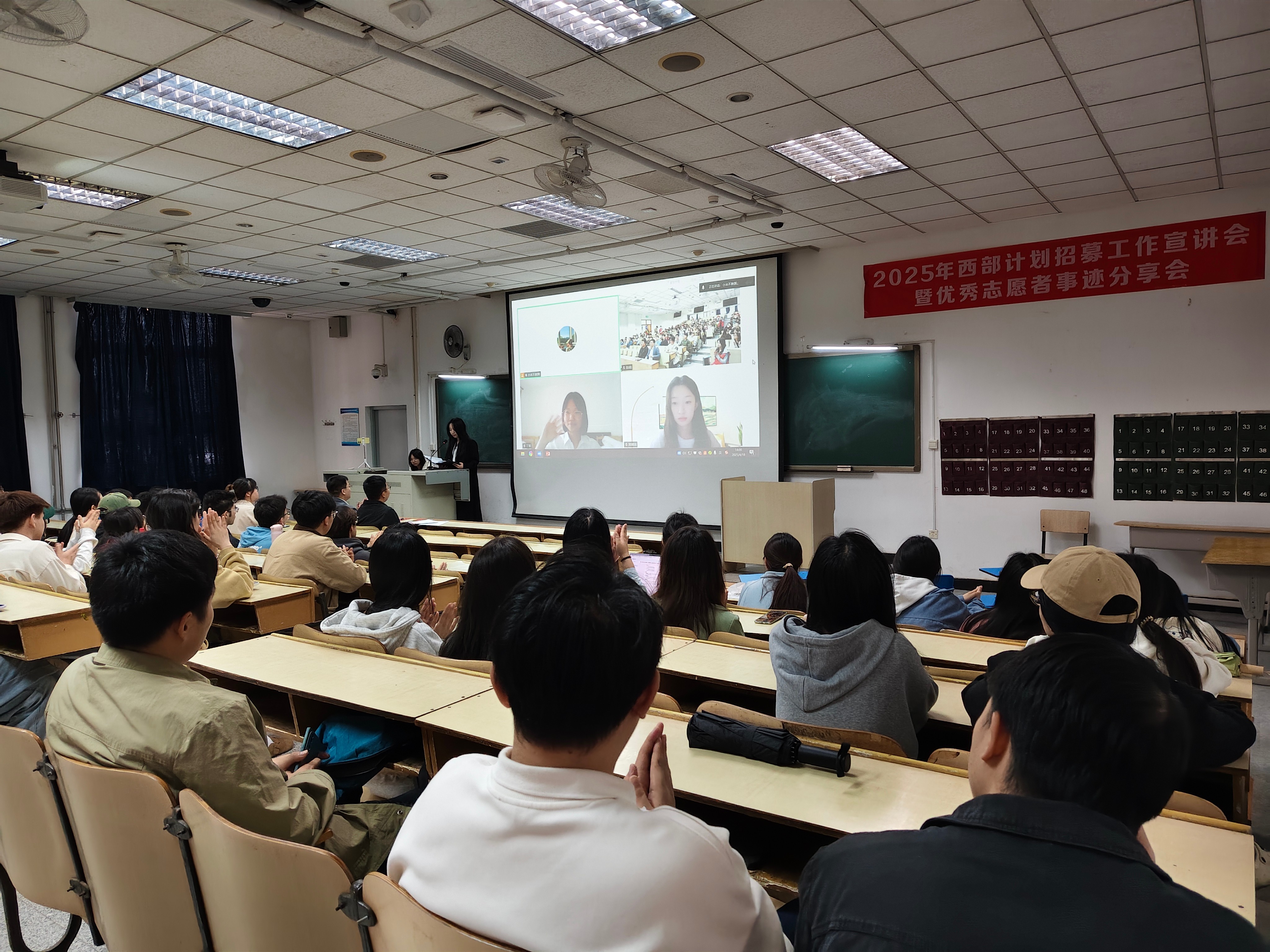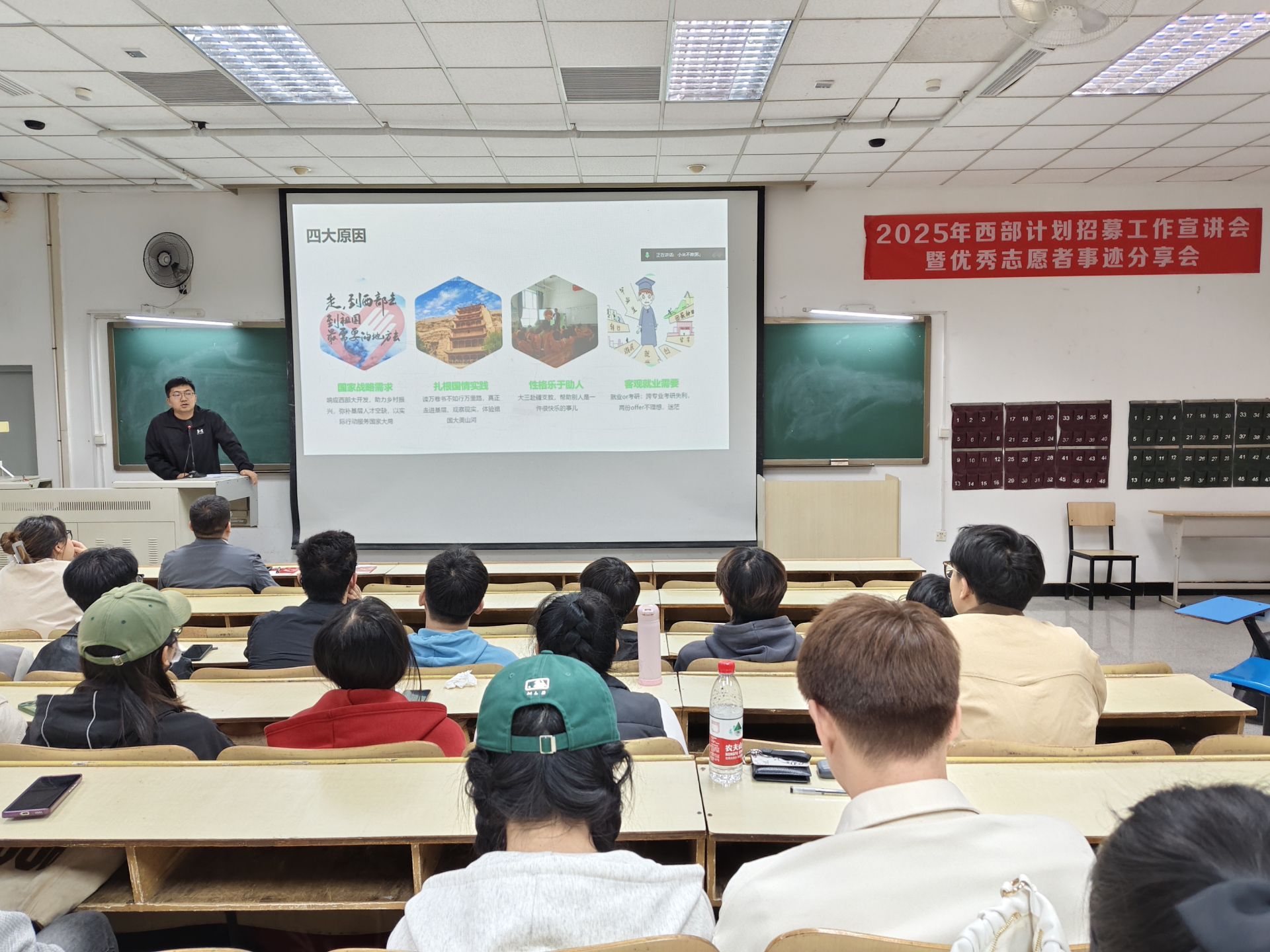 4月18日下午,校團委在4教101舉辦2025年西部計劃招募工作宣講會暨優秀志愿者事跡分享會。校團委干部劉海東對2025年西部計劃實施方案進行了全面宣講,我校曾服務于甘肅、新疆、兵團等地的優秀校友楊海東、丁麗、宮萌潔分享了志愿服務經歷,300余名畢業生代表參加。