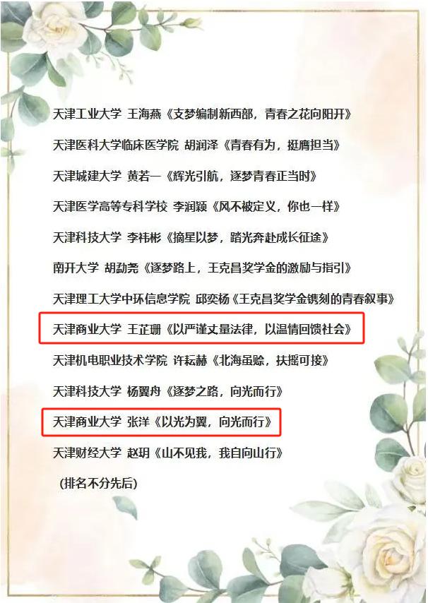 我校獲得2023-2024學(xué)年度“王克昌獎學(xué)金”的9名同學(xué)積極投稿,結(jié)合自身獲得獎學(xué)金的經(jīng)歷,講述在學(xué)習(xí)、科研、社會實踐、個人成長等方面的故事與感悟。經(jīng)基金會專家評審小組評選,從天津市50余所高校的百余篇學(xué)生作品中,評選出12篇優(yōu)秀文稿,我校共有兩篇征文成功入選。