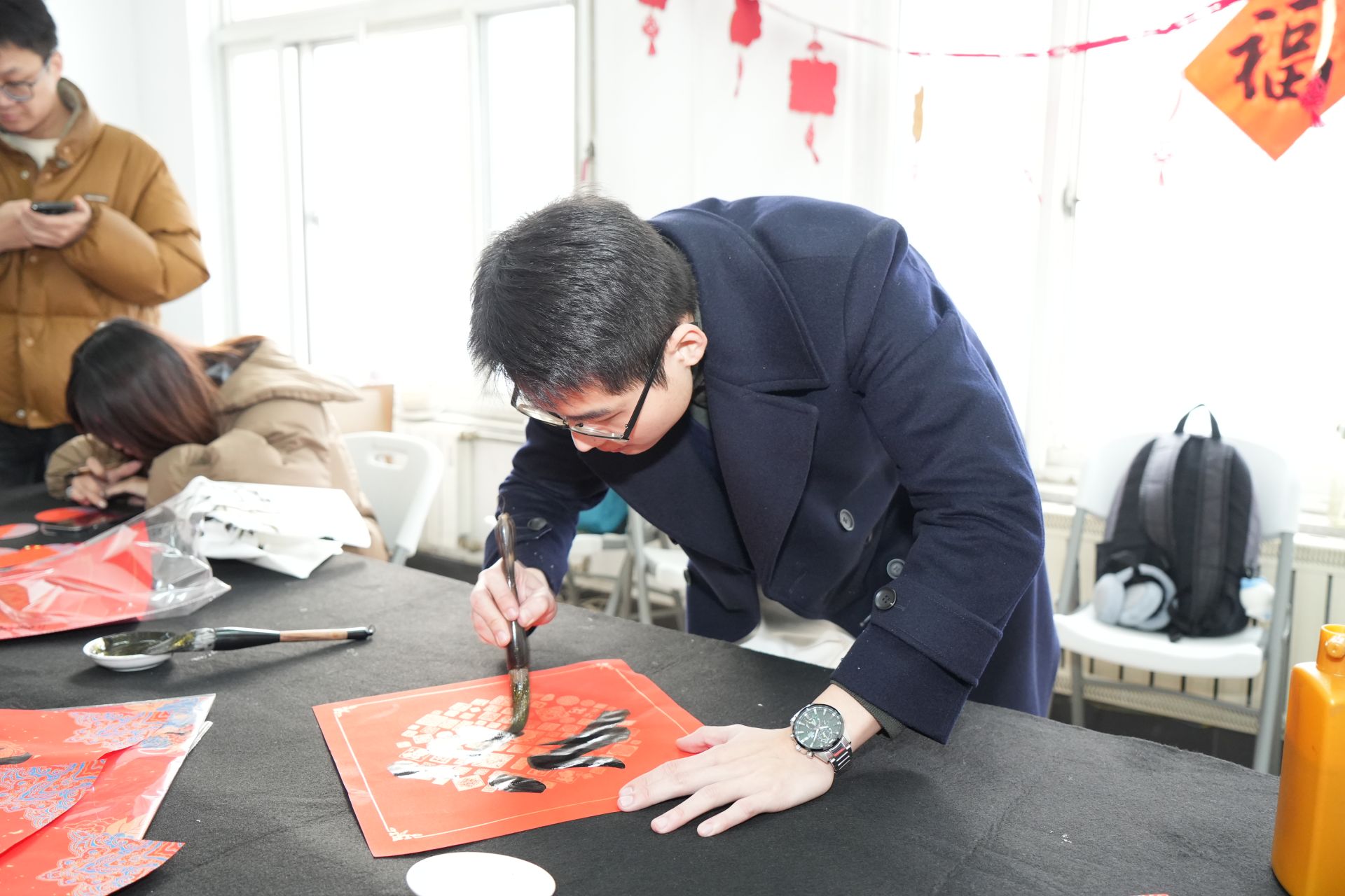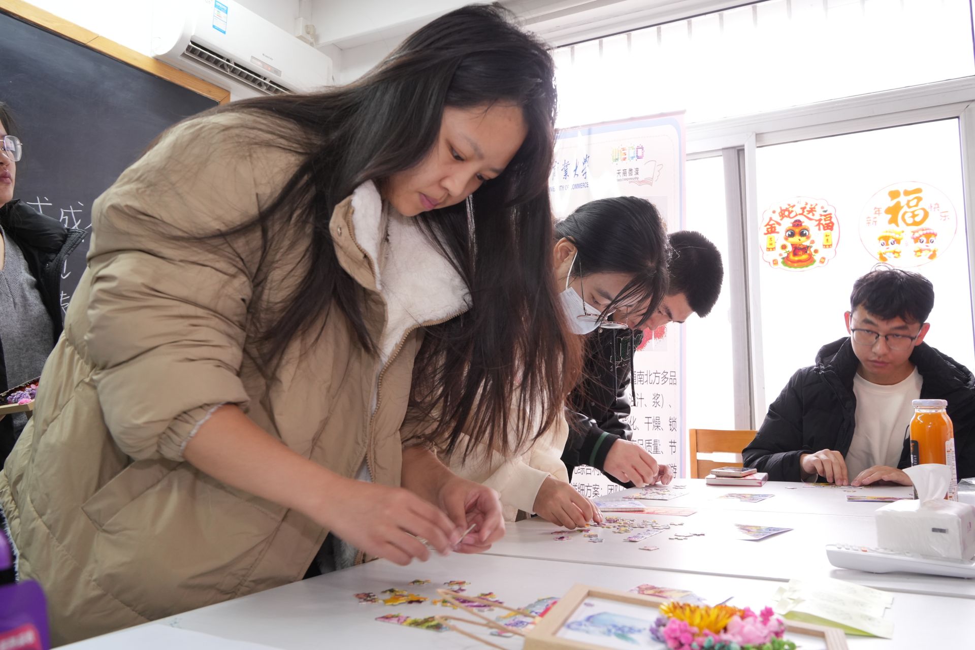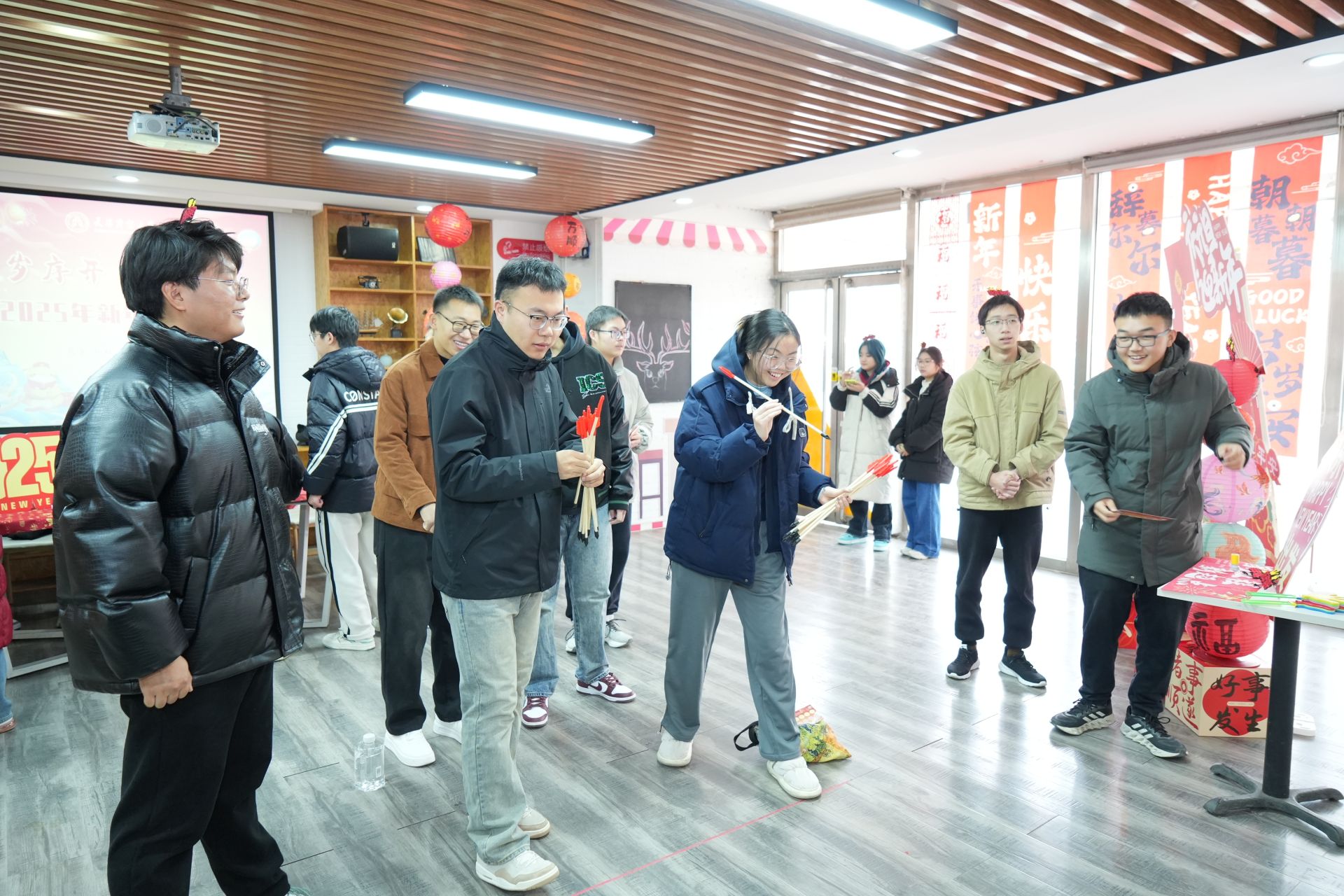 猜燈謎、做花燈、吃湯圓、寫春聯、拓福印、繪漆扇、投壺......2025年的第一天,黨委學工部在微渡創業中心一樓舉辦“新歲序開 同赴新程”新年游園會慶祝元旦佳節,吸引了400余名學生參與。