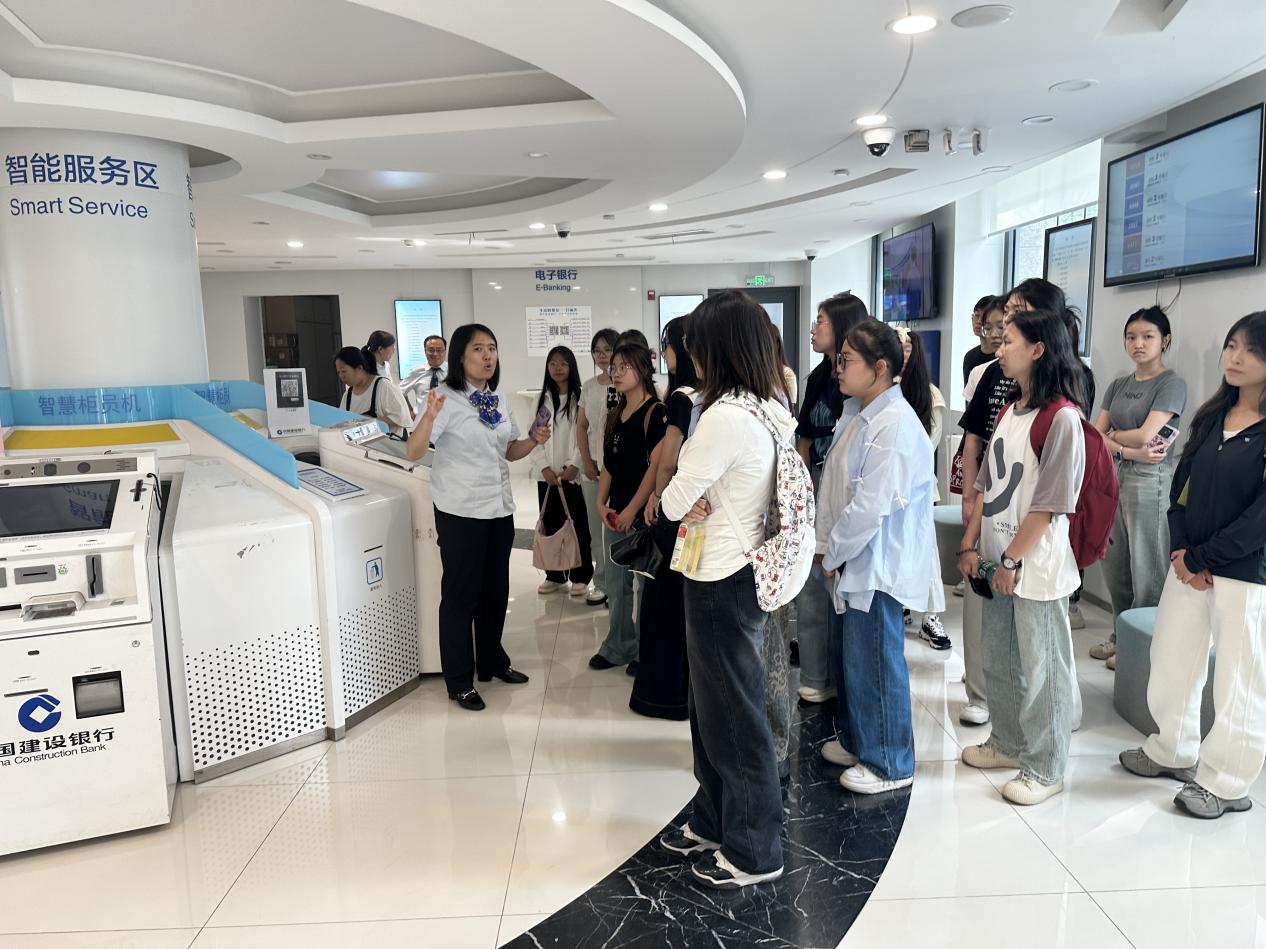 在營業(yè)大廳參觀環(huán)節(jié),孫國華以建行發(fā)展史為切入點,向師生們介紹了中國建設(shè)銀行從成立至今的服務(wù)宗旨與戰(zhàn)略轉(zhuǎn)型。他結(jié)合紅橋支行的區(qū)域特色,詳細講解了普惠金融、綠色信貸、數(shù)字化轉(zhuǎn)型等業(yè)務(wù)板塊,幫助同學(xué)們理解金融行業(yè)的社會價值。張若楠現(xiàn)場演示了智能柜員機、移動金融服務(wù)終端等設(shè)備的操作流程,并科普了反詐防騙、理財規(guī)劃等實用知識。她鼓勵同學(xué)們夯實專業(yè)基礎(chǔ),同時拓展跨學(xué)科視野。