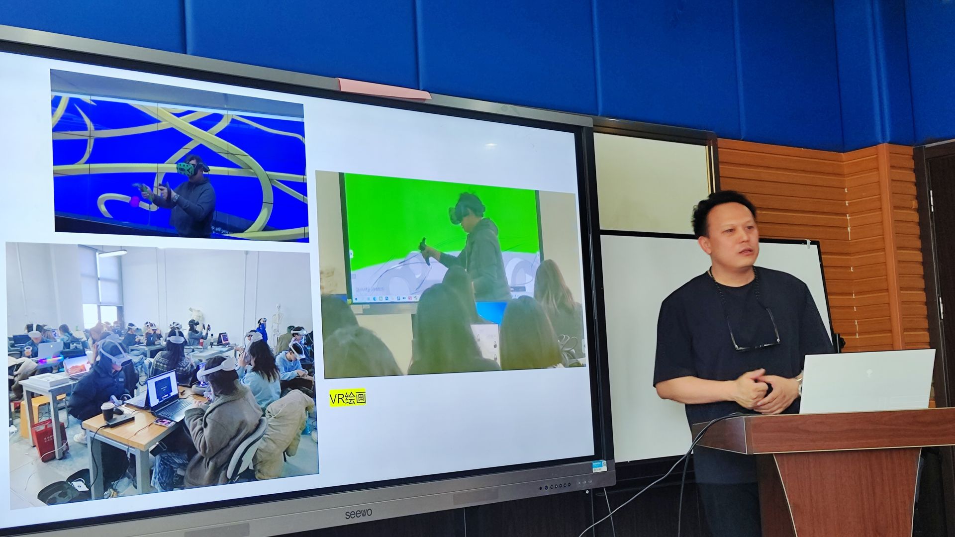 講座圍繞“交互中的學科視角”這一主題,從跨學科融合方法論、數字技術應用前沿、未來藝術教育展望三個維度展開深入探討。系統闡釋多學科交互設計理念,探討繪畫藝術在數字時代的延伸與創新;重點解析數字化展陳、數字寫生及投影無人機(具身智能)等新技術對視覺藝術的重構;深入探討元宇宙、AI設計及空間計算等前沿領域對藝術學科發展的影響。作為交互藝術設計領域的前沿研究學者和實踐者,王教授的研究聚焦“全域耦合化引擎接口設計”和“誘導交互設計自結合”的創新模式,其學術觀點為數字時代的藝術學科建設提供了重要理論支撐,其前沿研究成果案例,為繪畫系正在進行的“藝術+科技+商業”特色人才培養目標轉型提供了寶貴參考。