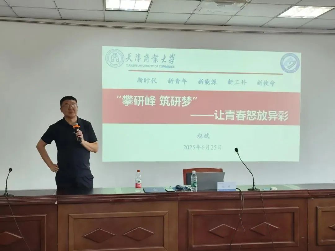 講座開始前,張瑩向趙斌教授頒發天津商業大學機械工程學院兼職教授聘書。講座中,趙斌圍繞“認知,把握新時代;治學,在乎點滴勤;修身,知命則無憂;養性,寧靜以致遠;交往,有舍才有得”五個篇章展開分享。他以1343天援藏經歷為切入點,用“家離得遠了,卻與祖國貼得更近”的感悟詮釋家國情懷,結合新時代低碳發展主旋律,強調我國“雙碳”目標對能源轉型與可持續發展的戰略意義,激勵同學們將個人理想融入國家發展大局。在治學領域,他點明研究生教育的創新本質,通過剖析能源動力領域超低排放循環流化床燃煤技術、CO?捕集利用等十大低碳技術難題,強調跨學科研討與實戰訓練的重要性;同時提出制定文獻閱讀計劃、參與低碳技術研發實踐等建議,引導學生夯實學術基礎、培養創新思維。談及團隊協作時,他以“理工戰神團隊”精神為例,倡導“予人玫瑰,手有余香”的合作理念,鼓勵同學們在跨學科、跨領域協同中提升責任感與使命感,積極參與“中國研究生能源裝備創新設計大賽”等賽事,以賽促學助力低碳目標實現。在個人修養層面,他引用古語闡釋修身內涵,倡導同學們以謙遜、踏實、真誠、周全的態度實現身心與心智的全面成長,在低碳科研道路上勇擔時代重任。