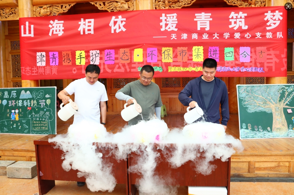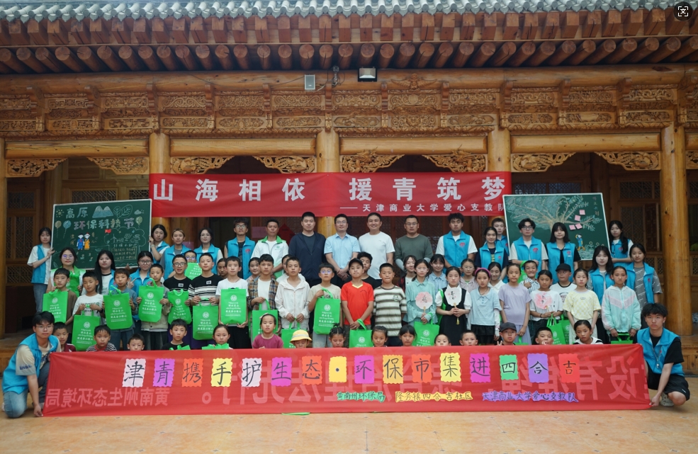8月3日,天津商業大學愛心支教隊聯合黃南州環保局、隆務鎮四合吉社區在四合吉村養老院舉辦“津青攜手護生態·環保市集進四合吉”高原環??萍际屑顒印⒓颖敬位顒拥挠刑旖驒z察系統援青干部任遠、梁家俊、王宗琦,黃南州環保局干部仁青華藏,天津商業大學愛心支教隊全體隊員以及50余名當地藏族中小學生。