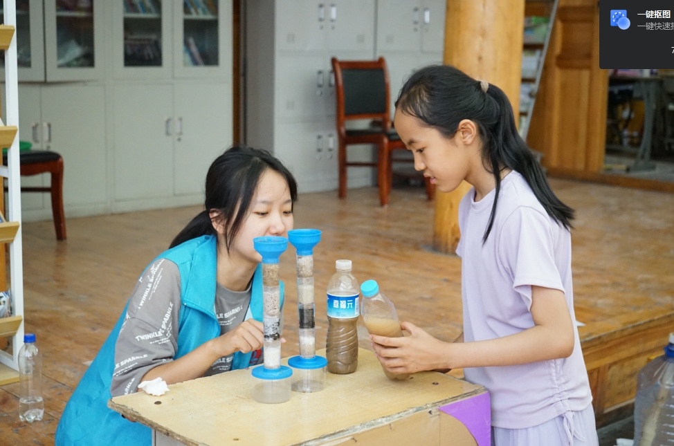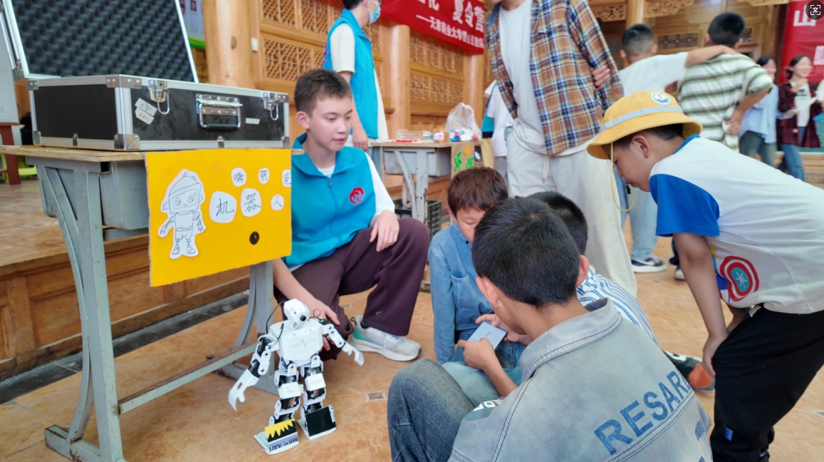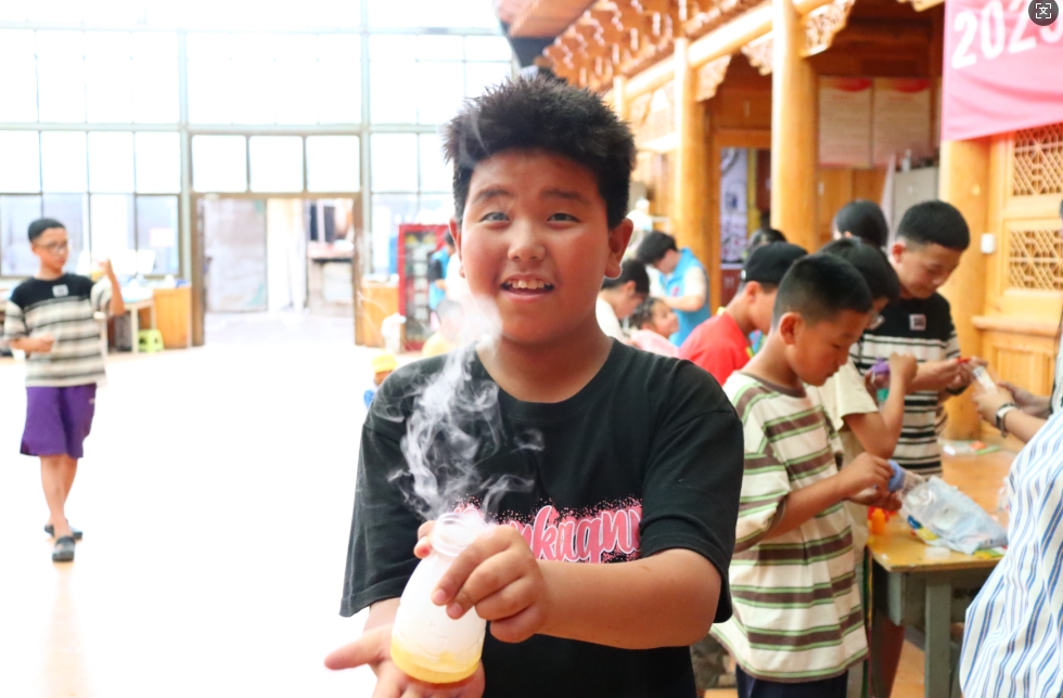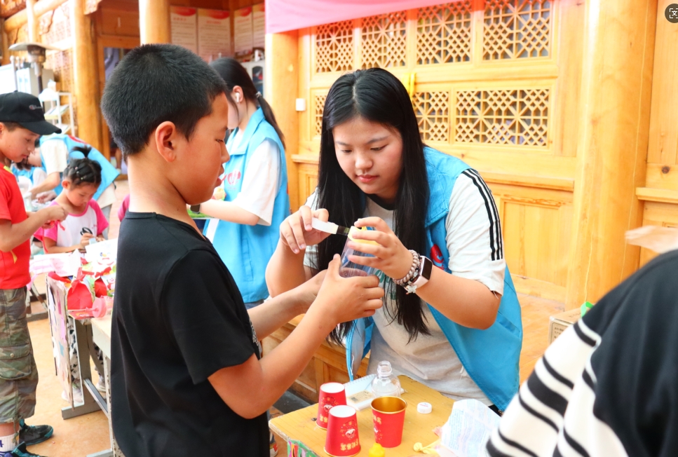 本次市集活動由一場干冰中投入熱水產生的“云?!闭嚼_序幕。“這就是二氧化碳,它既能造霧,也能加劇溫室效應。”支教隊隊長吳丹借機科普,“保護環境,就是讓白云留在天上,而不是變成廢氣飄在空氣里?!笔屑譃榛顒雍灥絽^、科技展示區、文創體驗區、環保體驗區、游戲互動區、未來機器人6個體驗區。在環保空調前,支教隊員現場演示“零氟制冷”,孩子們驚呼“原來清涼也可以零碳”;在文創體驗區,毛筆寫下“三江之源,綠我中華”的書簽輕搖墨香;創意手工制品如奶茶包裝袋紙巾筒等,激發了大家的環保創意。垃圾分類沙包投擲、環保迷宮、轉換生態等互動游戲,讓環保理念在寓教于樂中走進同學們心中,機器人的炫酷表演,更是點燃了青少年們內心中的創新火種。