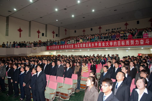 在黨旗和學(xué)院旗幟的舞動中,大會進入第二項新生新生入黨教育。經(jīng)濟學(xué)院黨建辦公室向新生具體介紹了入黨程序,并展示了黨支部 2010 至 2011 學(xué)年學(xué)生黨支部關(guān)于學(xué)習(xí)胡錦濤總書記在清華百年校慶上的講話與七里海感恩之行的兩項支部活動。和天津市三好學(xué)生、天津市優(yōu)秀學(xué)生干部等優(yōu)秀畢業(yè)生黨員竇唯、蔡元均,張環(huán)宇的優(yōu)秀事跡介紹,希望新生向他們學(xué)習(xí)。最后肖培榮書記在總結(jié)發(fā)言中號召廣大青年學(xué)生認真學(xué)習(xí)胡錦濤總書記在建黨九十周年大會上的講話,加強思想修養(yǎng),胸懷祖國,服務(wù)社會,首先做一名優(yōu)秀大學(xué)生,早日加入中國共產(chǎn)黨。會議在校歌中結(jié)束。