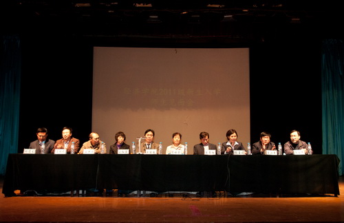 經(jīng)濟學(xué)院于 10 月 26 日下午在科學(xué)會堂召開 2011 級新生師生見面會 — 新生入黨教育暨新生入學(xué)教育啟動儀式。經(jīng)濟學(xué)院黨委書記肖培榮、副院長巫建國、副院長王常柏、國際經(jīng)濟與貿(mào)易系主任王中華、財政系主任王漢章、金融系主任劉紅霞、經(jīng)濟系副主任高建偉、產(chǎn)業(yè)經(jīng)濟研究所所長呂明元、金融系教師林德發(fā)及經(jīng)濟學(xué)院全體輔導(dǎo)員、班主任、全體學(xué)生黨員、 2011 級全體新生參加此次會議。大會由經(jīng)濟學(xué)院黨委副書記張玉娟主持。