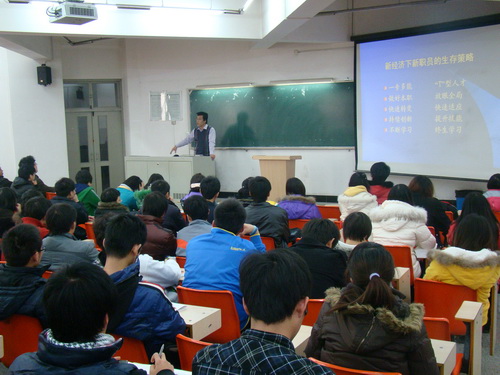 孫繼國先生從現階段我國大學生的就業情況,企業需要什么樣的人才,新經濟下新職員的生存策略、及心態要求等問題進行了詳細的講述。指出:在學習方面,目前學生應該在努力學好自己的專業知識的同時還應該從其它多方面培養自己的能力,他指出企業需要的人才應該是:一專多能、 T 型人才;做好本職,放眼全局;快速轉變,快速適應;持續創新,提升技能;不斷學習,終生學習。另外,孫繼國先生還指出,大學生在就業過程中,及作為新的職場人還應該具有積極的心態,即:自知、自尊、自信、自強、自制;以及較強的團隊合作精神,即:寬容、關愛、負責、誠信、雙贏。孫繼國先生還指出,一個人要想成功可以通過“認知自我、設立愿景、拜師學樣、調整心態、制定計劃、全力以赴“來達到。