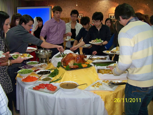 11月26日晚,合作學院外教與留學生精心準備了感恩節晚宴,邀請部分中國師生一起共同慶祝美國傳統節日—感恩節。