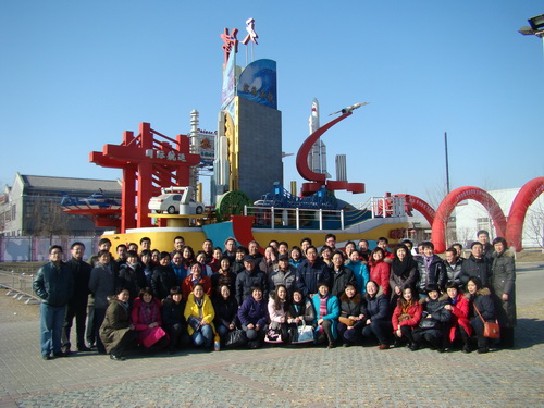 午餐后,大家來到龍順莊園前廣場,在一輛大型彩車前集體留影;這輛彩車就是最終落腳于龍順莊園的、在國慶 60 周年參加過天安門檢閱并載譽而歸的天津國慶彩車——“濱海新貌”;這輛彩車猶如一艘即將遠航的巨輪,彩車上的‘大乙烯’、‘生物鏈’、‘大火箭’、‘曙光計算機’、‘衛星’等相關展示,以及鼓樓、楊柳青年畫等標志性符號,充分體現了天津的地域特色、文化底蘊與科技水平,濃縮了天津改革開放 30 年的建設成就。