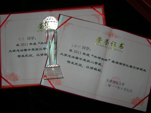 在全校總決賽之前,我院學生會學習部和 My Space 英語俱樂部聯合舉辦了院內初選,經過院內選拔賽的激烈競爭, 2010 級財務管理(中澳) 1004 班學生周易以及 1003 班學生王婉伊分別以總分前兩名的成績,從 12 名初賽選手中脫穎而出,代表學院參加全??倹Q賽。兩位同學分別以 Attitude Has Changed the World 和 Apple Has Changed the World 為題,憑借流利的口語和精彩的發揮,最終分獲二、三等獎。此外,王婉伊同學還將在 11 月代表學校參加天津市的決賽。