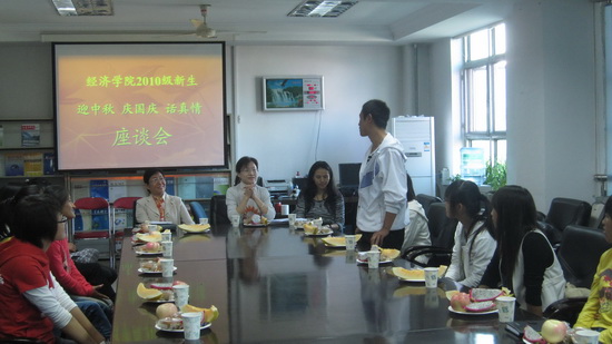 在座談會上,經濟學院黨總支肖培榮書記首先致辭,她首先代表院領導和全體老師向2010級同學表示衷心的問候,祝福同學們在學校度過一個愉快的中秋佳節,并希望2010級同學在校期間,奮發向上,認真學習,樹立信心,以良好的精神面貌體驗新的生活和學習,盡快適應新環境,調整狀態,找準目標,鍛煉身體,能夠以堅強、樂觀、開朗、向上的心態勇敢面對各種挑戰,繼續努力拼搏,實現人生遠大理想。同時,對家庭經濟困難的同學,肖培榮書記希望這些同學能夠“自強、自立、自覺”,不斷進取,在心理健康、學習能力、人際交往、社會實踐等方面提高自己,豐富自己,不畏艱難,增強信心,自強不息,立志成才,不辜負家長和學校的殷切期望,勇于展現自己的人生價值,以飽滿的熱情度過大學生活,以優異的成績回報父母、學校和社會的期望。