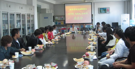9月19日上午,經濟學院“迎中秋 慶國慶 話真情”2010級本科生新生代表座談會在三樓會議室舉行。剛剛進行完軍訓的近20名新生代表與經濟學院劉小軍院長、黨總支肖培榮書記以及輔導員老師進行了深入交流。