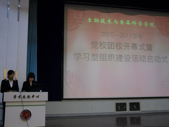 9月28日,生物技術(shù)與食品科學(xué)學(xué)院2010—2011學(xué)年第一期黨校團校開幕式在學(xué)術(shù)交流中心舉辦。學(xué)院黨總支書記魯曉翔教授、校黨委組織部副部長王立云老師、學(xué)院黨總支副書記孫文利老師、團委書記陳璐老師、輔導(dǎo)員吳強老師等出席,學(xué)生黨支部、團委、學(xué)生會及新生骨干學(xué)生近200人參加了開幕式。