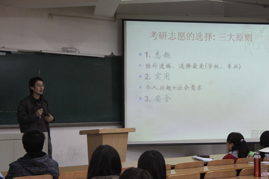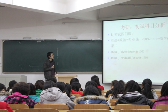 在講座中,馬老師首先介紹了研究生考試的目前形式與具體要求,并闡述了考研對改變命運的重要意義。馬天藝老師指出:考研志愿的選擇非常重要,可以彌補高考遺憾,重新選擇理想中的高校;個人興趣和社會需求是考研選擇的重要因素;耐心與毅力是考研取勝的非智力因素。馬老師不僅提出了詳實的復習計劃,還對考研的物質和心理準備提出了可行性建議。他不僅介紹了英語的學習計劃,還介紹了數學、政治和專業課的復習計劃,而且非常實用和科學。