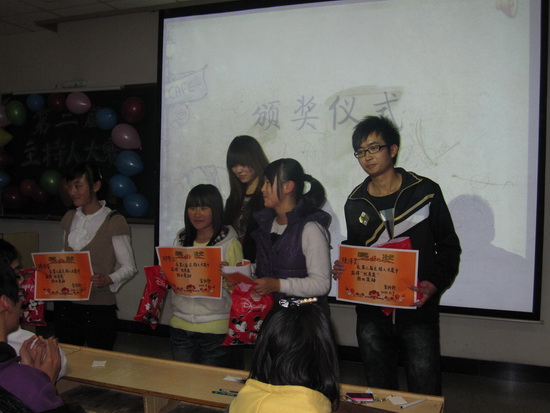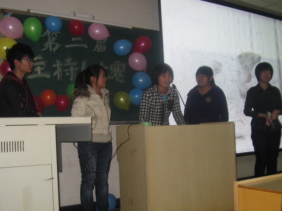 活動(dòng)一開始,在主持人宣布了比賽規(guī)則后進(jìn)入了第一個(gè)環(huán)節(jié)“親友團(tuán)介紹”,選手的親友團(tuán)采用各種各樣的方式對(duì)選手進(jìn)行了詳細(xì)的介紹,同時(shí)也為選手制造現(xiàn)場(chǎng)氣氛進(jìn)行拉票,使在場(chǎng)觀眾及評(píng)委對(duì)選手有了充分的了解。隨后進(jìn)入第二環(huán)節(jié)“配樂朗誦”,各位選手選取自己的閱讀材料并根據(jù)所配的音樂進(jìn)行朗讀,本環(huán)節(jié)考察了選手的普通話水平及朗讀功底。比賽第三環(huán)節(jié)“即興發(fā)揮”,選手根據(jù)給出的五個(gè)詞組編一段小故事,此舉考察選手的應(yīng)變能力。隨后進(jìn)行了本次比賽最后一個(gè)環(huán)節(jié)“二人配合”,每組兩位選手根據(jù)抽中的節(jié)目進(jìn)行開場(chǎng)白主持,考察選手之間的配合及應(yīng)變能力。最后進(jìn)入到頒獎(jiǎng)環(huán)節(jié),選手孫薈荔取得第一名的好成績,其他各位選手都取得了相應(yīng)的名次,大賽在優(yōu)美的頒獎(jiǎng)曲中結(jié)束。