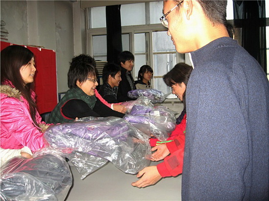 嚴冬即將到來,學院領(lǐng)導和老師們非常關(guān)注困難同學的生活狀況,也都極力為貧困生們營造一個良好無憂的學習氛圍和環(huán)境,并力所能及從生活上、學習上幫助貧困生。陳璐老師在簡短的發(fā)言中介紹道,為幫助他們度過寒冬,學院特地為部分家庭經(jīng)濟困難的學生購置了棉衣,把學校的溫暖、老師的關(guān)懷送到同學們身邊。