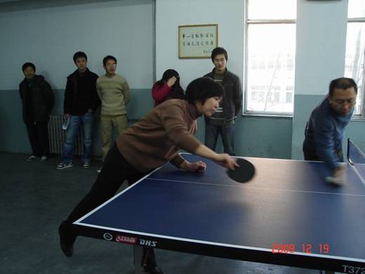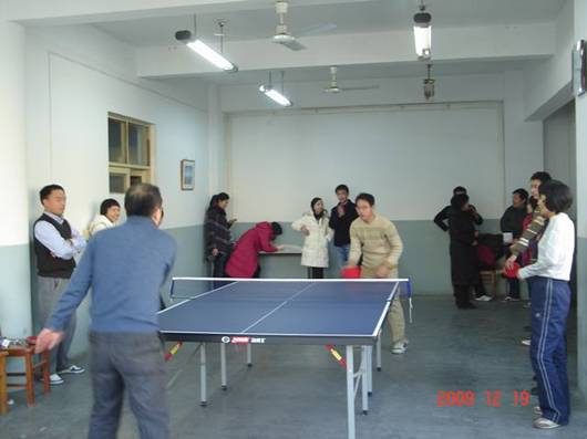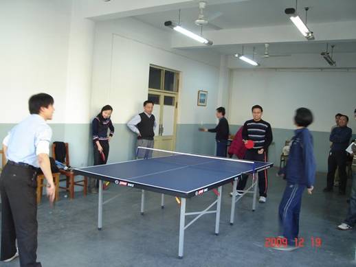 12 月 18 日 下午,由研究生部與研究生會組織的師生乒乓球友誼賽在研究生部多功能活動室開賽。在體育文化節乒乓球比賽中取得優異成績的張晨輝、劉健東、黃耀坤、歐陽君、周開方組成學生代表隊與教師代表隊進行友誼賽。生物技術與食品科學學院副院長王素英教授、法學院張春普副教授、公共管理學院老師史永勝、王元明,研究生部老師趙建洪、劉澤勤、董運平、賈永強,組成教師代表隊參賽。這場比賽是繼去年之后舉辦的第二場師生乒乓球友誼賽,旨在加強師生交流,增進師生友誼,共同促進,以健康的體魄從事學習與工作。比賽在歡聲笑語中開始,在歡聲笑語中結束。比賽結果在此忽略,雙方收獲的不是比分,而是師生共同的快樂!
