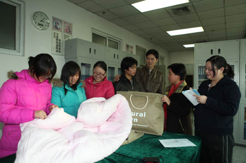 近日,氣溫驟降,天氣寒冷,為了使每一位貧困生溫暖過冬,信息工程學院專門為 2009 級貧困學生每人發放一床棉被,將溫暖送到同學們心坎上。