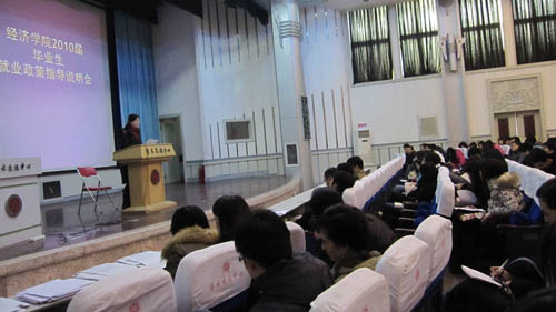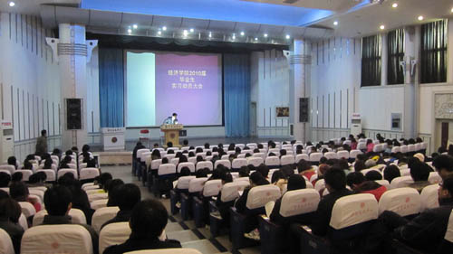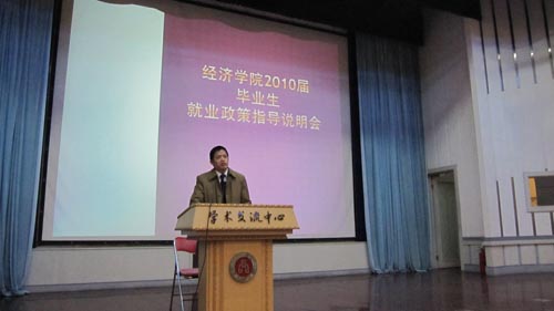 近日,經(jīng)濟(jì)學(xué)院為了讓畢業(yè)生能更好地了解學(xué)校的實(shí)習(xí)要求,能夠在國(guó)家及天津市就業(yè)方針政策的指導(dǎo)下進(jìn)行求職活動(dòng),專(zhuān)門(mén)召開(kāi)了 2010 屆畢業(yè)生實(shí)習(xí)動(dòng)員會(huì)暨就業(yè)政策指導(dǎo)說(shuō)明會(huì)在學(xué)術(shù)交流中心舉行,經(jīng)濟(jì)學(xué)院巫建國(guó)副院長(zhǎng)出席會(huì)議并講話,學(xué)院黨總支張淑敏副書(shū)記與各系輔導(dǎo)員、學(xué)院教學(xué)秘書(shū)以及全院全體畢業(yè)生參加了會(huì)議。
