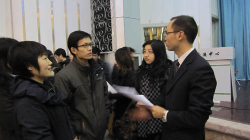 最后,經(jīng)濟(jì)學(xué)院輔導(dǎo)員王欣欣老師 針對(duì) 2010 屆畢業(yè)生就業(yè)形勢(shì),國(guó)家、天津市出臺(tái)的各類(lèi)促進(jìn)就業(yè)、鼓勵(lì)創(chuàng)業(yè)的優(yōu)惠政策向 全體畢業(yè)生作了詳細(xì)的說(shuō)明, 并 對(duì)三方協(xié)議的簽訂注意事項(xiàng)及就業(yè)工作流程和手續(xù)辦理做出了指導(dǎo) , 并強(qiáng)調(diào)了就業(yè)政策中一些關(guān)鍵點(diǎn)。她 希望全體畢業(yè)生正確看待就業(yè)形勢(shì),調(diào)整就業(yè)心態(tài),樹(shù)立先就業(yè)、后擇業(yè)的就業(yè)理念,積極主動(dòng)抓住就業(yè)機(jī)會(huì),早日找到適合自己的工作。湘財(cái)證券天津果園東路證券營(yíng)業(yè)部李伯政總經(jīng)理從用人單位的角度向全體畢業(yè)生談了社會(huì)對(duì)畢業(yè)生的需求狀況以及如何找到適合自己的工作,并現(xiàn)場(chǎng)進(jìn)行了招聘。