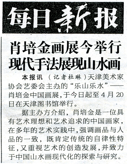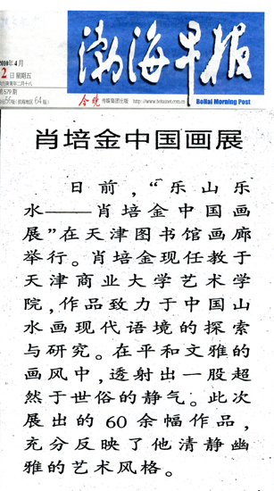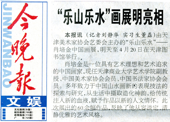 由天津美術家協會藝委會主辦的“樂山樂水”——肖培金中國畫展, 4 月 2 日 至 4 月 20 日 在天津圖書館舉行。肖培金老師是我校藝術學院副教授、中國美術家協會會員、中國書法家協會會員。多年致力于中國山水畫新的表現技法的探索與研究,多副作品在我市和全國國畫中參展,受到業界的好評。《晨鐘》 2001 年參加“建黨八十周年全國美展”; 2002 年座客中央電視臺《真情無限》欄目,為環保事業捐贈競拍《雪歸圖》,所拍款項全部捐贈國家綠色工程;《寒梅圖》 2003 年參加“菜鄉情”全國中國畫提名展,《新血液》參加“全國美術書法精品展”;《松巖天界開》 2004 年參加中國畫名家邀請展,《晨鐘》參加“畫說天津六百年大型畫展”,《山莊青煙》參加全國中青年中國畫提名展,《冷艷幽香》 2007 年參加“齊白石獎中國畫作品展”,分別在日本、韓國舉辦個人畫展; 2008 年由甘肅畫院承辦的“培金水墨——肖培金中國畫展”在蘭州甘肅美術館舉辦;《雪山流云》 2009 年參加“全國第五屆中國美協會員中國畫精品展。其作品《黃土地的希望》 1999 年被中央電視臺收藏;《張騫出使西域》 2000 年被敦煌博物館收藏;《溪亭論道》 2001 年被中央電視臺書畫院收藏;《雪歸圖》 2002 年被天津豐澤電子集團收藏;《新血液》 2003 年被中國美術家協會收藏;《山莊青煙》 2004 年被齊白石藝術館收藏;《苦吟圖》 2008 年被中國教育學會書法教育委員會收藏,《春雪》被人民大會堂收藏;《溪山論道圖》 2008 年被甘肅美術館收藏,《秋水》被甘肅畫院收藏;《大漠風情》 2009 年被印度大使館收藏;《春山讀書圖》 2010 年被天安門城樓收藏。 《里程碑》 2002 年獲 “5.23 全國美展 ” 優秀獎,并獲天津展區金獎, 2002 年榮獲教育部全國學校藝術教育先進工作者;《寒梅圖》 2003 年獲 “ 菜鄉情 ” 全國中國畫提名展優秀獎;《山莊青煙》 2004 年獲全國中青年中國畫提名展銀獎; 2005 年被評為天津市優秀青年美術家;《富貴圖》 2008 年獲 “ 天津市第二屆花鳥畫大展 ” 優秀獎。被中國文聯授予 “ 海峽兩岸德藝雙馨藝術家 ” 。 此次展出的 60 余幅作品,反映了他從容淡定、清靜優雅的藝術風格。天津日報、今晚報、每日新報、渤海早報先后作了專題報導。