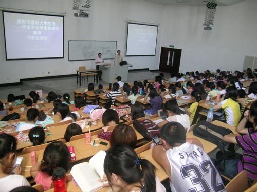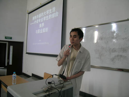 顧悅博士結合自身的經歷講述了在世界經濟滑坡,就業形勢嚴峻的當前,外語專業大學生應當有怎樣的心態,如何做到以不變應萬變;回答了如何通過了解自己、尊重自己、培養自己的綜合素質,提高自己的競爭力、追逐自己心中的夢想、做出合理的職業規劃,最終無憾于四年的青春;談到了個人的價值體現、個人的天賦和素養等發人深省的話題。他詼諧的語言,獨到的思想,精彩的演講贏得了同學們熱烈掌聲。在講座過程中,同學們積極參與互動,踴躍提問發言,場面氣氛熱烈,顧悅博士針對同學們提出的問題一一給予回答。