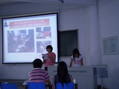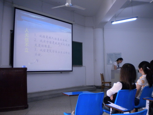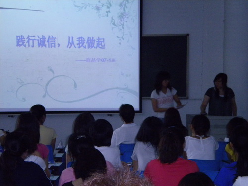 在前兩個階段, 06 、 07 、 08 級各班級同學們積極參與,認真準備,以各種形式有針對性地對當今大學生周圍存在的不誠信現象進行廣泛的調查、討論,并分析原因,提出對策,形成班級總結材料。學院選取七個班級從大學生的信仰誠信、經濟誠信、學術誠信、就業誠信和網絡誠信等方面交流匯報,提出大學生誠信標準。交流活動中,同學們播放了采訪周圍同學、請教我校 “誠信教育”課主講老師的 DV 短片和生動有趣又富含教育意義地案例視頻,與現場同學討論互動。在輕松愉快的氛圍中,同學們圍繞自己對誠信人生的理解,解讀誠信標準的要求,使全體學生干部受到了深刻的感性教育,達到了預期效果。