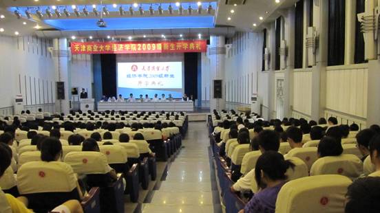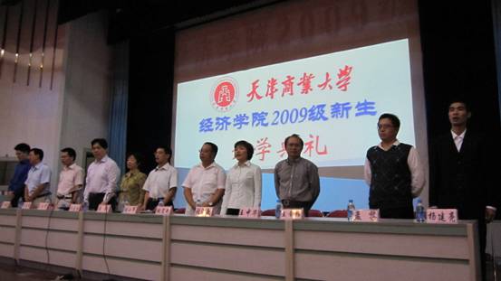 9 月 18 日上午,經濟學院在學術交流中心舉行了 2009 級新生開學典禮,經濟學院黨總支白玲書記、劉小軍院長、張淑敏副書記、張宏武副院長以及各系主任出席開學典禮, 經濟學院 2004 屆畢業生,現為 百事物流科技有限公司天津分公司業務部經理孟黎以及 現任渤海銀行河西支行行長王巖巖 應邀回母校參加了開學典禮, 開學典禮由經濟學院副院長巫建國教授主持,全體新生班主任與經濟學院 530 余名新同學參加了典禮。