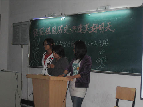 9 月 20 日 晚 6 : 30 在 3-201 ,“銘記祖國歷史,共建美好明天——國慶六十周年國情知識競賽”通過一段精心制作的視頻使同學們重溫了祖國的過去,接下來是知識問答環節,分為必答題和風險題兩部分,經過激烈的比拼,評出了一、二、三等獎和優秀獎。之后為了表達對祖國的熱愛, 08 級的同學們獻上了他們精心排練的話劇《祖國》, 09 級的同學們準備了精彩的才藝展示,贏得了在場同學陣陣熱烈的掌聲。