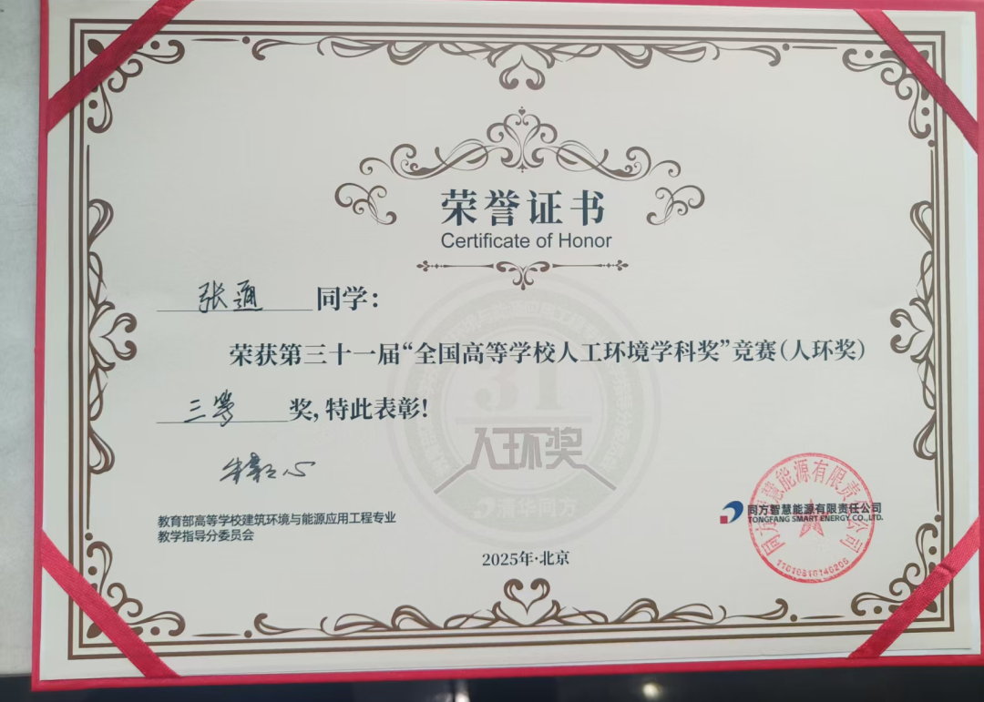 8月29日,第31屆“全國高等學(xué)校人工環(huán)境學(xué)科獎”專業(yè)基礎(chǔ)競賽(簡稱“人環(huán)獎”)頒獎典禮在清華同方科技廣場舉行。我校機(jī)械工程學(xué)院建筑環(huán)境與能源應(yīng)用工程專業(yè)2022級學(xué)生張通榮獲全國三等獎。
