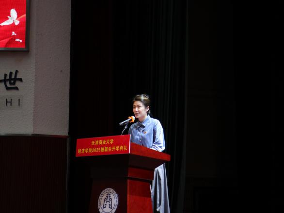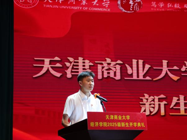 國貿(mào)系系主任路璐作為教師代表,為新生規(guī)劃如何度過美好校園時(shí)光,提出三點(diǎn)建議:珍惜課堂與老師的“思維碰撞”、學(xué)會(huì)給大腦“松綁”、別讓手機(jī)“偷走”青春光景。經(jīng)濟(jì)學(xué)類2506班班主任李亭亭作為新生班主任代表,鼓勵(lì)新生相信自己、腳踏實(shí)地,同時(shí)攜手同窗、共同成長。2022級(jí)本科生柯淏嵽同學(xué)作為在校生代表,從“設(shè)定目標(biāo)、勇敢嘗試、摯友同行”三個(gè)維度分享經(jīng)驗(yàn),呼吁新生以實(shí)際行動(dòng)踐行天商人的初心、詮釋經(jīng)院學(xué)子的擔(dān)當(dāng)與使命。經(jīng)濟(jì)統(tǒng)計(jì)2501班本科生范一諾同學(xué)作為新生代表,以《中國奇譚》小妖怪作比,傳遞不甘平庸的勇氣與腳踏實(shí)地的韌勁,與全體新生共勉,在大學(xué)“修煉場”中沉淀成長。