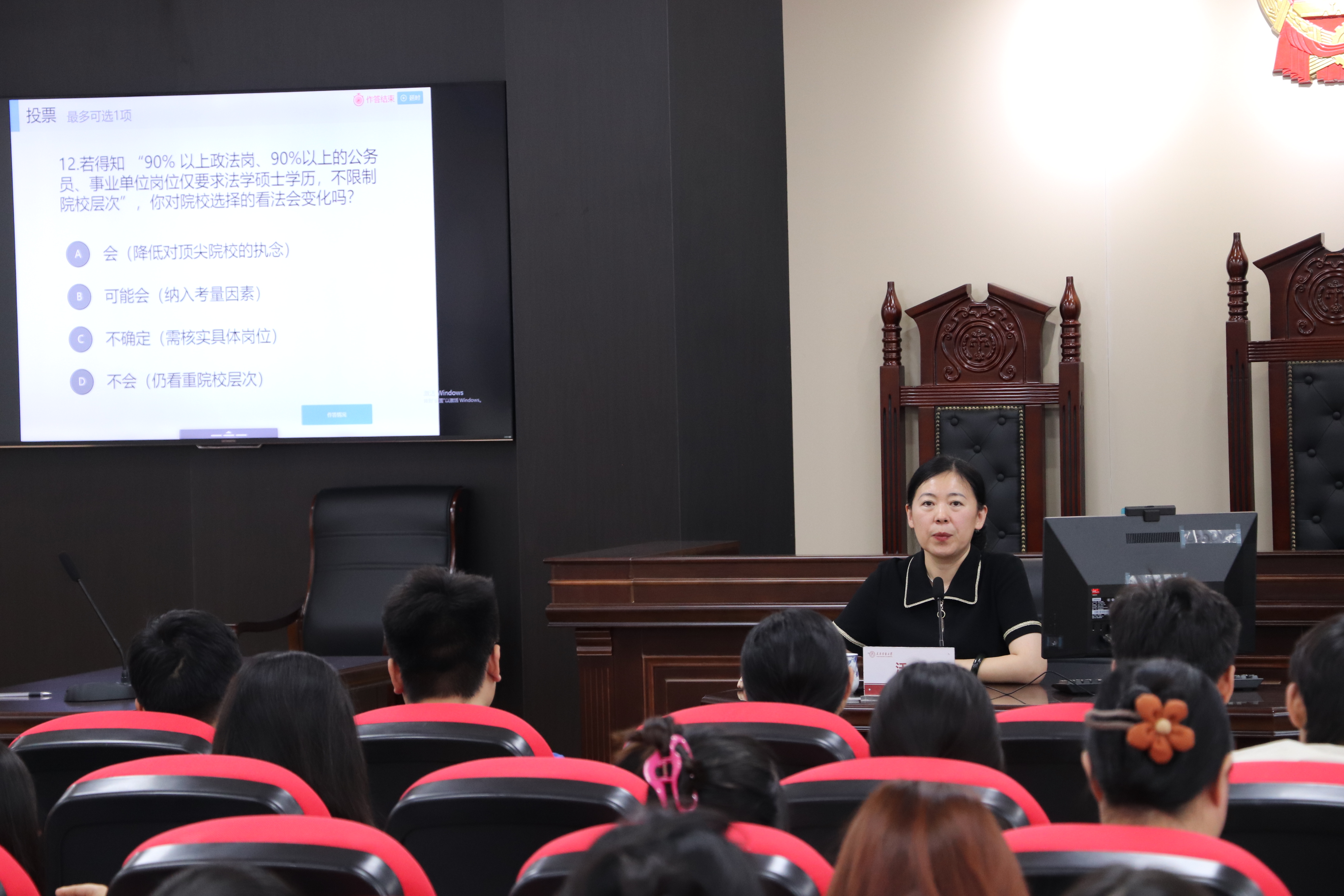 根據現場問卷調研形成的數據,沃耘分析當前學生的“學情”與考研競爭的“考情”,并針對法碩、學碩以及不同院校的選擇給出具體建議,同時明確學院將結合學生需求,在考研資料共享、備考經驗交流、心理疏導等方面提供精準支持。最后,向全體備考學子送上真摯祝福,鼓勵大家堅定目標、科學備考,以積極心態應對考研挑戰。