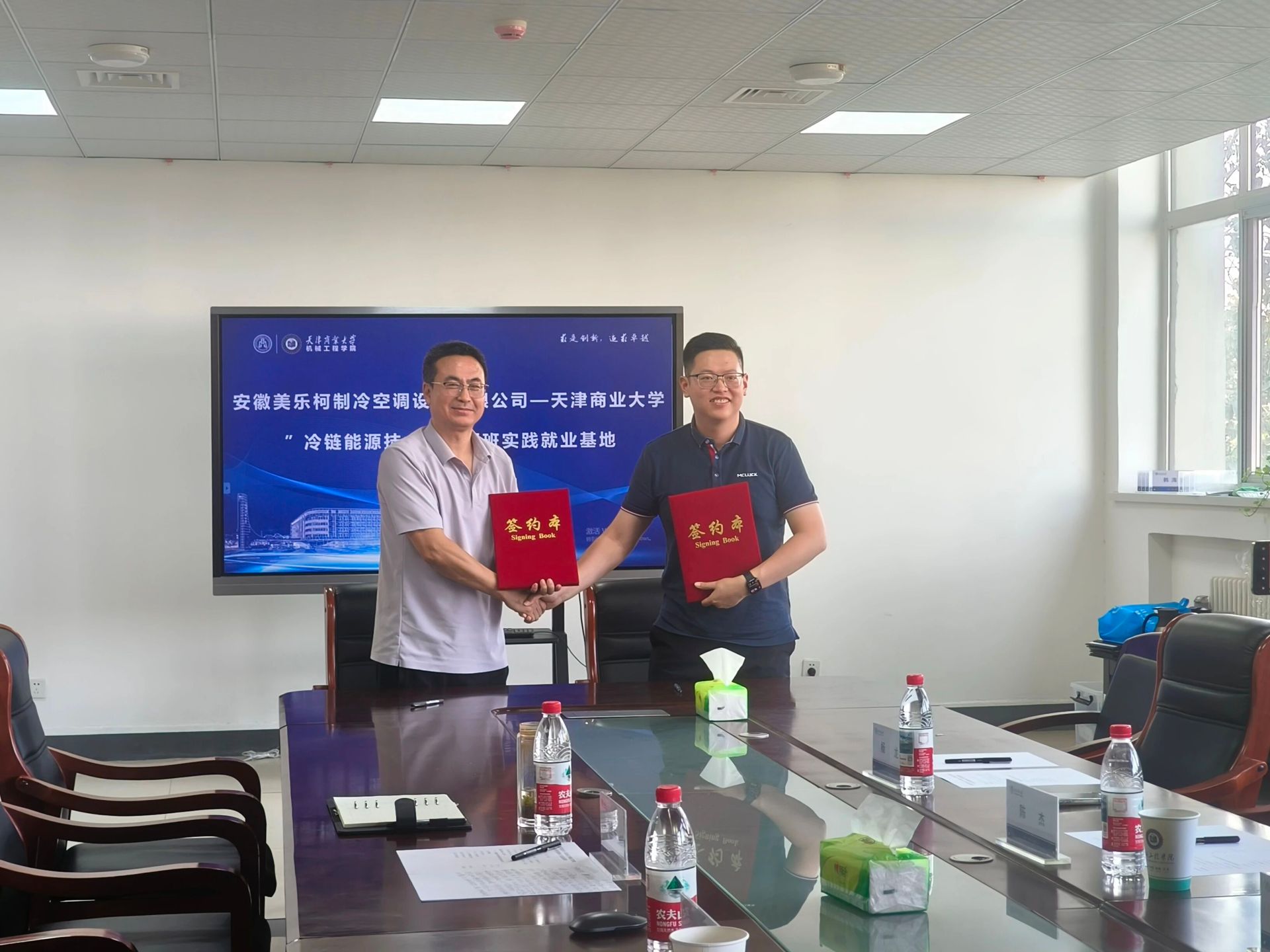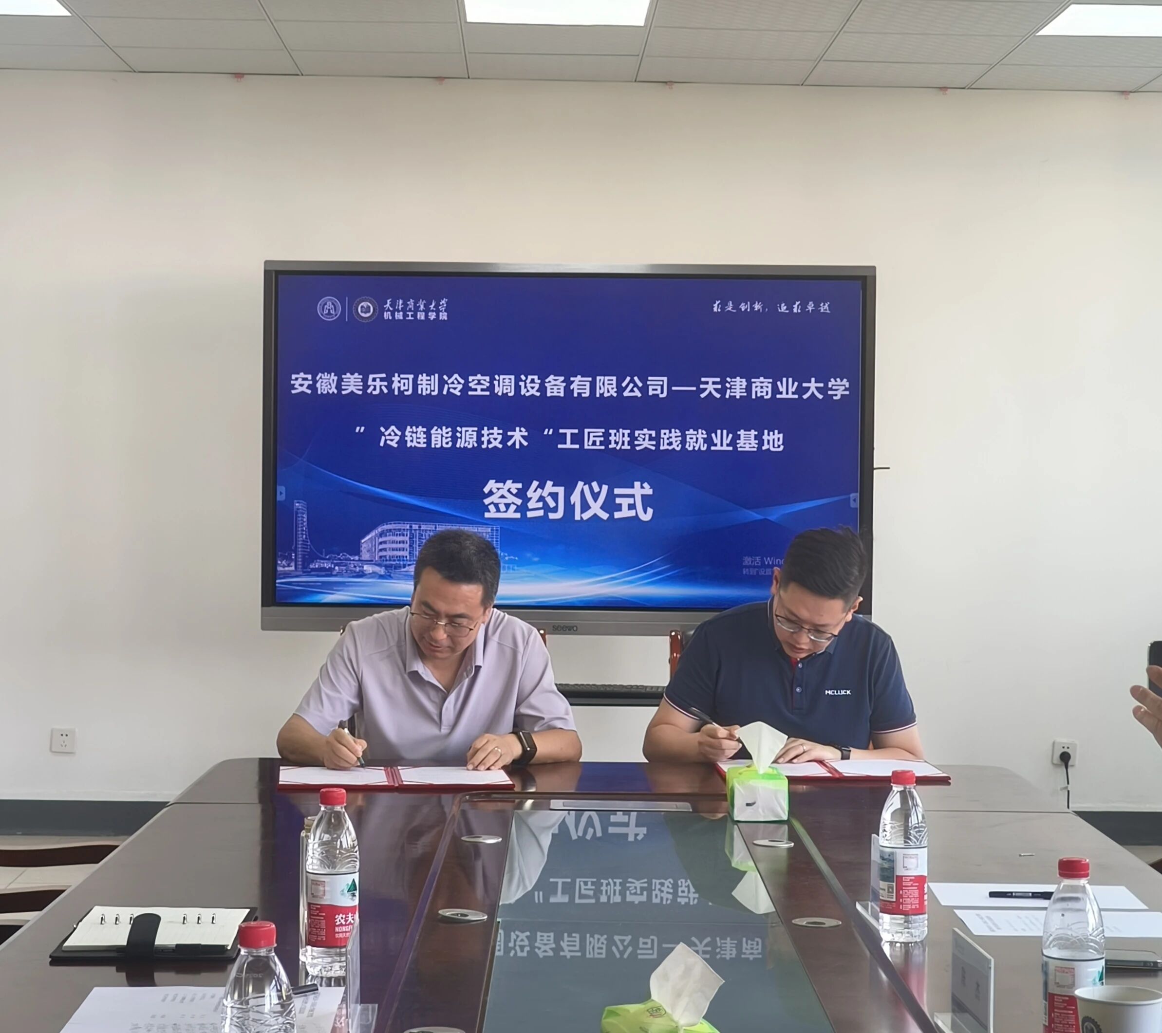 為加強產教融合與校企合作,促進人才培養與就業緊密銜接,實現人才供需的高效匹配,9月26日下午,安徽美樂柯制冷空調設備有限公司董事長陳杰、公司企管總監李群、公司人力資源經理楊龍一行受邀到訪機械工程學院開展校企合作交流。期間,雙方共同舉行了“冷鏈能源技術”工匠班實踐就業基地簽約儀式。學院院長劉圣春、專業教師張志強出席活動。