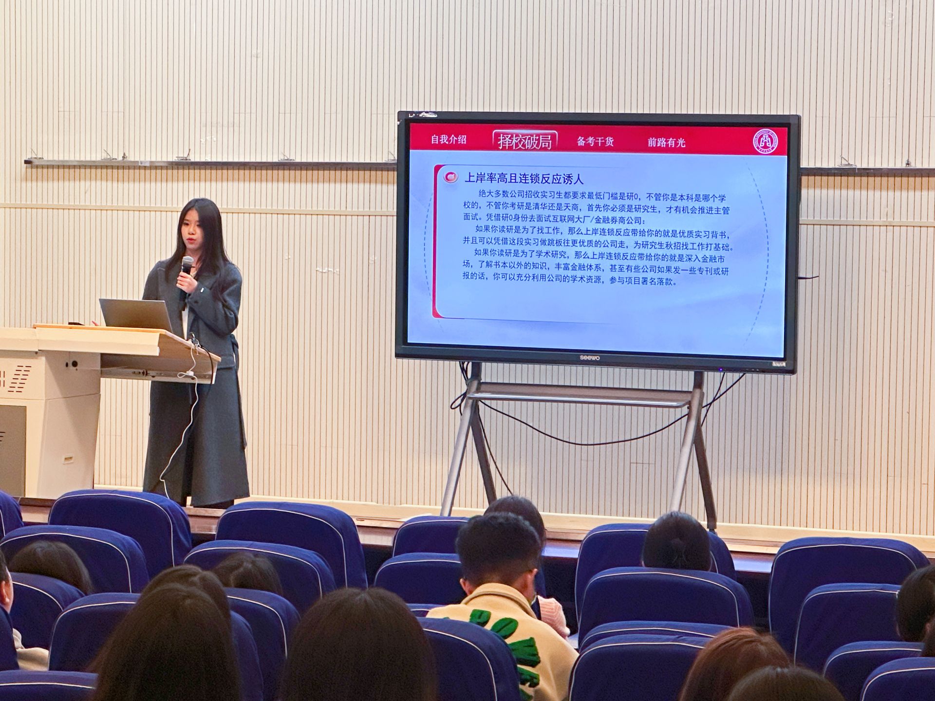 經(jīng)濟(jì)學(xué)院優(yōu)秀在讀研究生代表劉洋以《考研有方向堅(jiān)持有回響—考研經(jīng)驗(yàn)分享》為題,結(jié)合自身實(shí)戰(zhàn)經(jīng)歷,毫無(wú)保留地分享了在擇校、備考和職業(yè)規(guī)劃等方面的寶貴經(jīng)驗(yàn),重點(diǎn)從院校選擇、時(shí)間管理、備考方法等方面闡述心得體會(huì)和有效方法,為考研學(xué)子科學(xué)規(guī)劃復(fù)習(xí)節(jié)奏、破解備考路上的困惑提供實(shí)用參考。