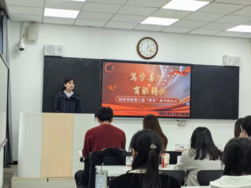 青芽班2023級成員代表常林佳和2024級成員代表王詩雅分別分享了在青芽班的成長感悟,同時也表示將珍惜此次機會,以勤勉篤學強化本領、以積極實踐錘煉能力,為“青芽班”的建設與發展貢獻自身力量。