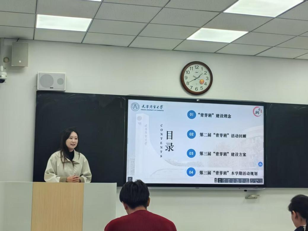 “青芽班”班級導師李佳麗對本學期“青芽班”建設方案進行了詳細介紹。李佳麗指出,“青芽班”構建起以“一張清單”積分制、“兩類導師”分組制、“三色理念”模塊制為核心的育人機制。在此基礎上,以“五育并舉”為核心的“青衿濟夢”活動清單,涉及“德、智、體、美、勞”五個方面,激勵學員結合該清單制定規劃,進一步明確自身成長目標與發展方向。本學期“雙導師制”將持續深化,助力各位學員全面發展。