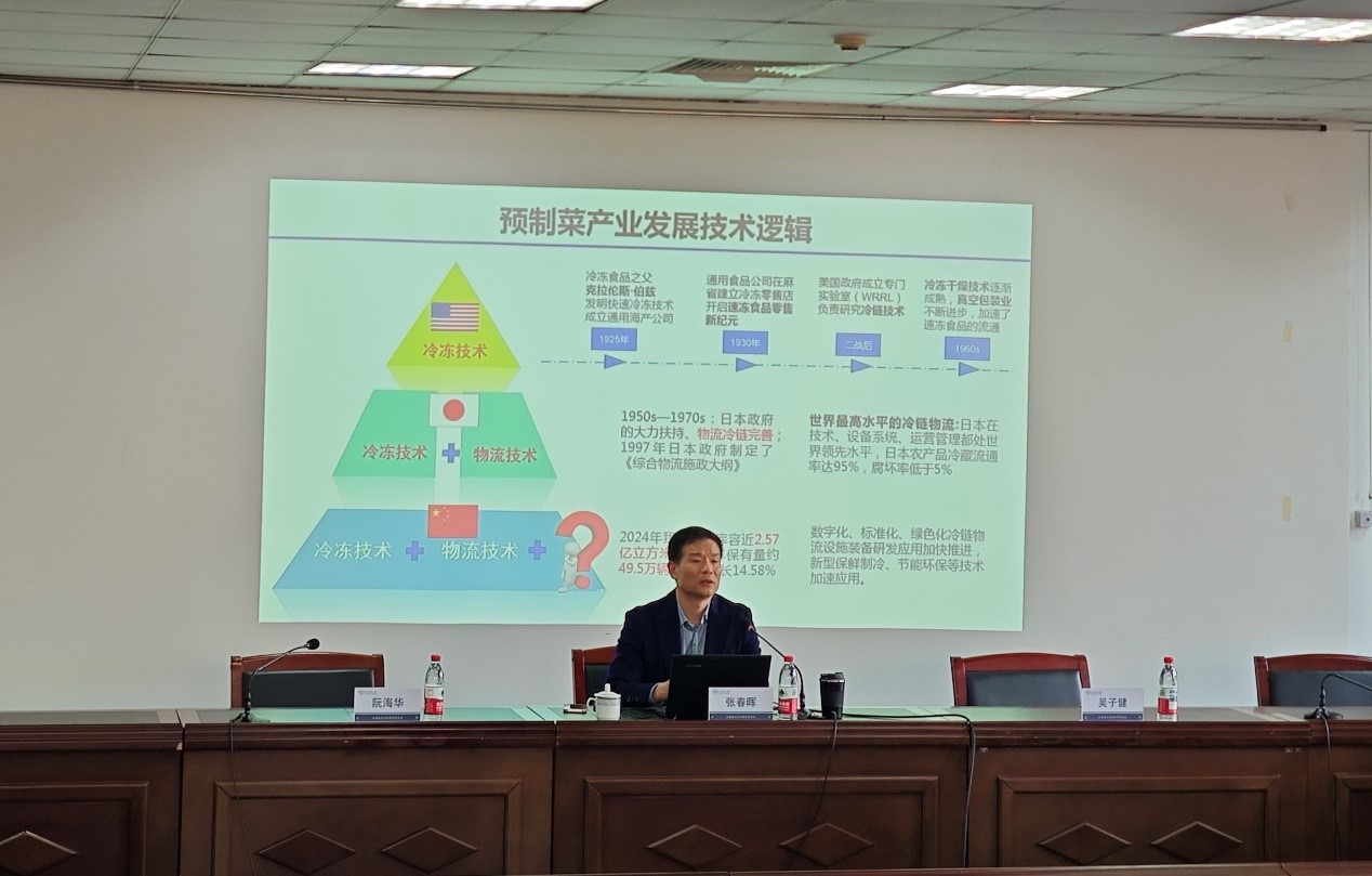 張春暉研究員系統梳理了預制菜產業的發展脈絡,深入闡釋了預制菜的“前世今生”,并對比分析了國內外預制食品產業的發展路徑。重點介紹了其團隊在鎖鮮技術領域的多項創新成果,包括“凍眠鎖鮮技術”“電場輔助凍眠鎖鮮技術”以及“肉類食材無晶深冷鎖鮮技術”等行業內領先技術,并結合團隊在全國多地的調研與產業化實踐,給予參會教師和學生以專業的啟迪和思考。在互動環節,師生們就課題申報,預制菜營養保留、文化認同等話題踴躍提問,張春暉研究員細致解答。