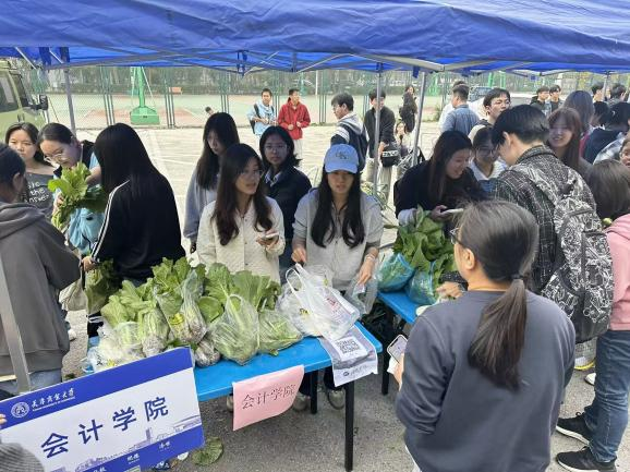 10月15日,系列活動第二場如期而至。本階段在延續集體勞動傳統的基礎上,著重強化各學院的組織自主性與團隊協作效能。從“天商農場”里的協同采摘、高效稱重,到“蔬菜集市”上的攤位布置、創意營銷,各個環節均由學生主導完成。活動提升了學生經費管理、成本核算等實務能力,讓學生在完整的生產鏈條中理解勞動與價值創造的關系。
