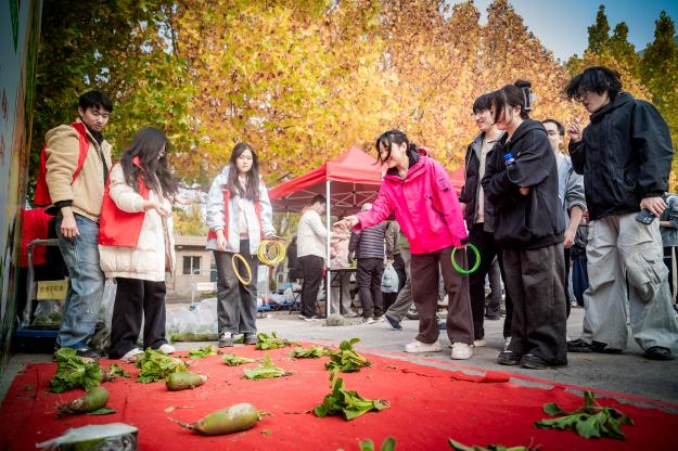 11月5日,系列活動在豐收的喜悅中迎來收官。本次集市規模遠超以往,蔬菜品類增至十余種,并創新開設“趣味套圈”互動環節,勞動成果的分享過程充滿歡聲笑語。現場氣氛熱烈,師生們在交易與互動中共同感受豐收的喜悅,體會勞動帶來的滿足感與成就感,為學校秋季學期的“天商農場”系列活動畫上圓滿句號。