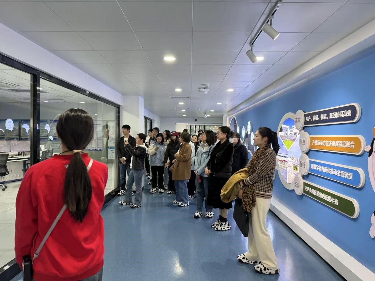 師生們先后參觀了海河乳品公司智慧工廠文創(chuàng)走廊和乳品加工現(xiàn)代化生產(chǎn)線,生動(dòng)展現(xiàn)了海河乳品的發(fā)展歷程與品牌特色,見證了企業(yè)一路走來的輝煌成就。在生產(chǎn)線,大家了解了牛奶從飼料種植、奶??茖W(xué)喂養(yǎng),到產(chǎn)品研發(fā)、生產(chǎn)加工,再到冷鏈運(yùn)輸?shù)募庸ぎa(chǎn)業(yè)鏈全過程,切實(shí)感受到了先進(jìn)的生產(chǎn)工藝和前沿的技術(shù)創(chuàng)新所帶來的震撼。每一瓶牛奶的包裝設(shè)計(jì)、每一項(xiàng)生產(chǎn)環(huán)節(jié)的精細(xì)把控,都彰顯著企業(yè)對(duì)品質(zhì)的執(zhí)著追求和對(duì)創(chuàng)新的不懈努力。通過講解交流,師生們深入了解了牛奶在我國的普及歷史,從老字號(hào)堅(jiān)守?zé)熁饸獾狡焚|(zhì)極致守護(hù)百姓健康生活,深刻體會(huì)到海河乳品作為民族企業(yè)的堅(jiān)守與執(zhí)著、責(zé)任與擔(dān)當(dāng)。