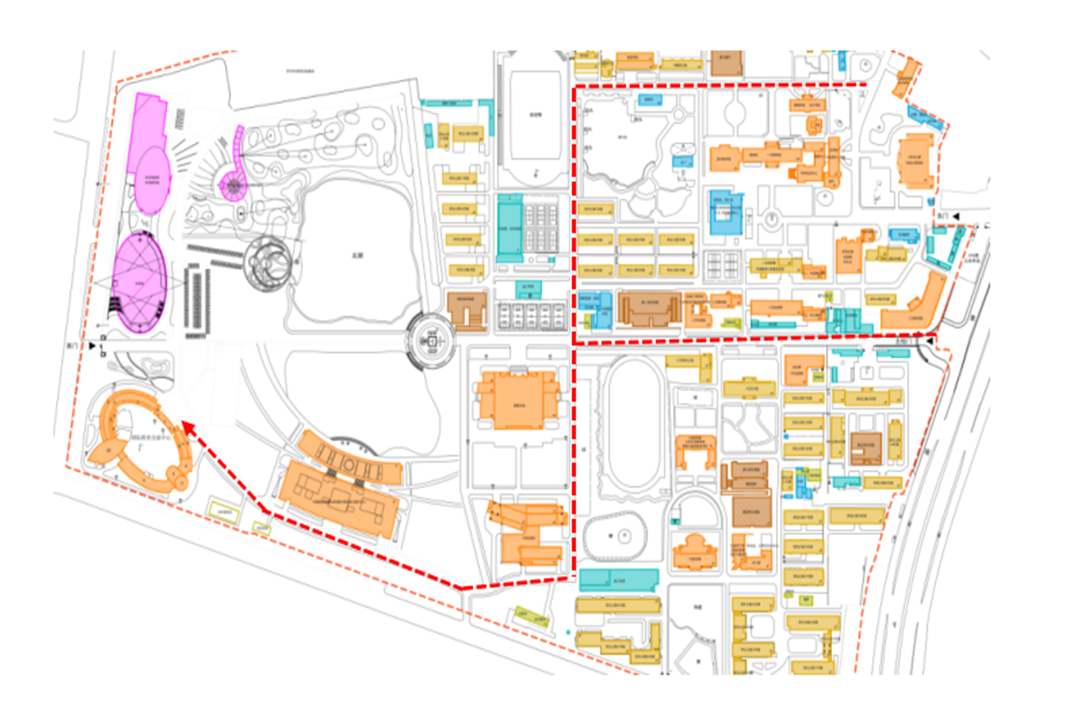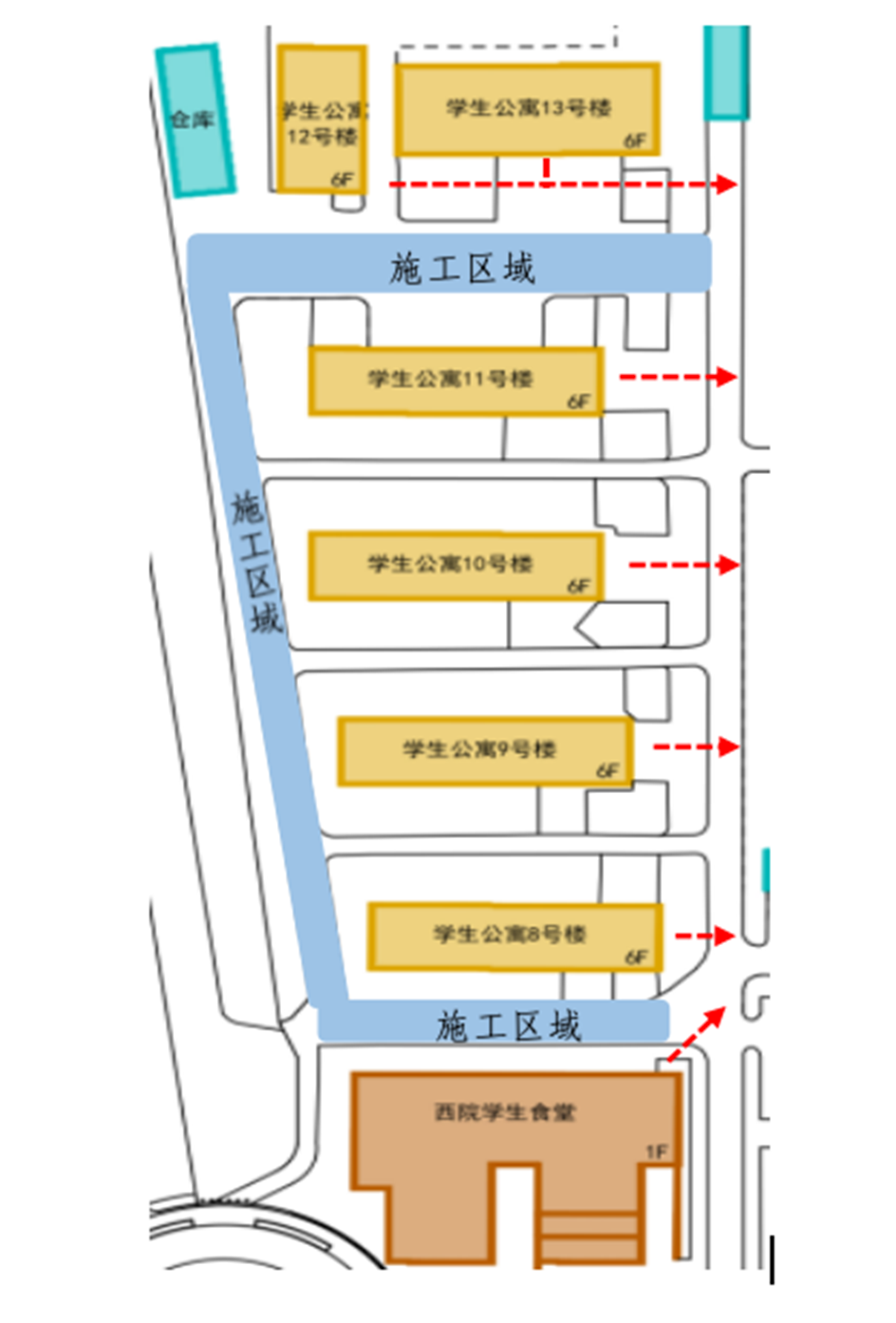 西區8-13號學生宿舍樓間道路施工封閉區域及學生出行路線示意如下圖所示: