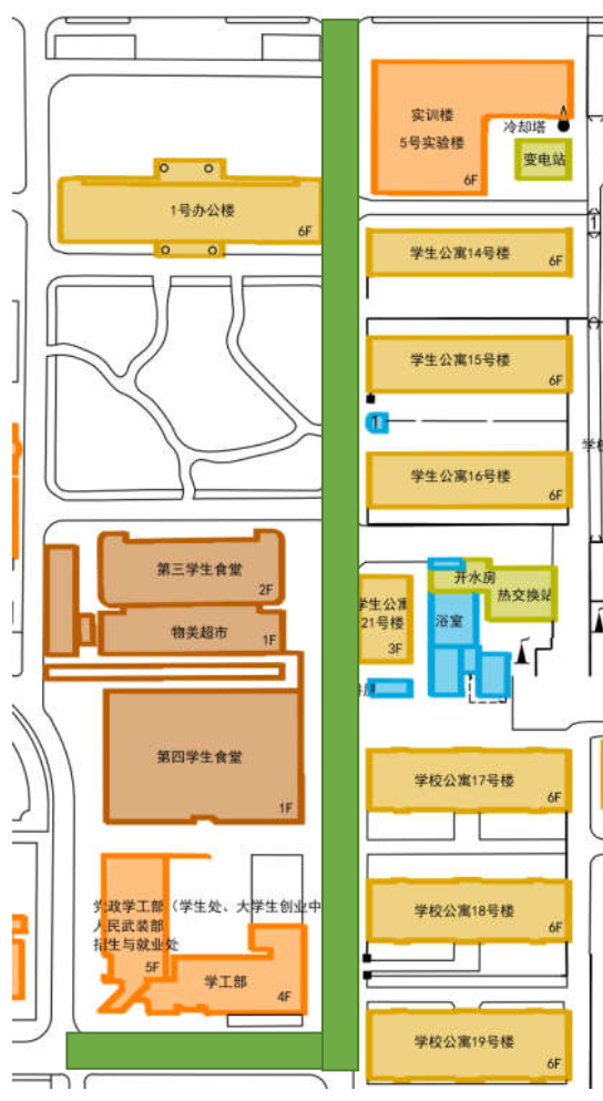 根據工作安排,學校計劃于8月1日至8月30日對1號辦公樓東側至學工樓南側道路進行施工,施工區域如下圖綠色區域所示。