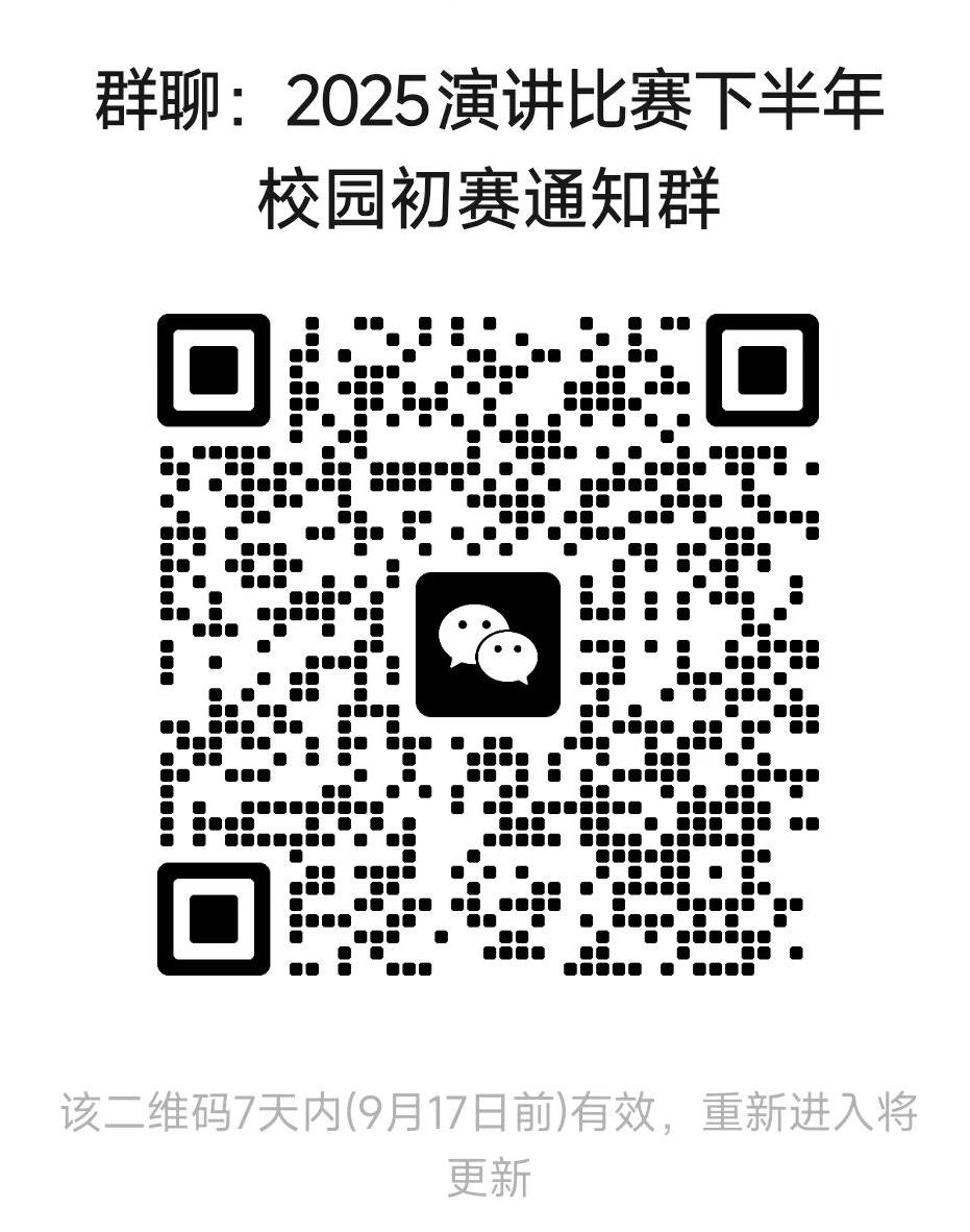 定題演講:選手以大賽公布的定題演講題目Strike the Waves(擊水中流,破浪前行)為依據,自擬小標題錄制3分鐘英語脫稿演講視頻,并在規定時間內通過超星學習通進行提交,詳情請掃碼進群并關注群通知(定題演講題目介紹請見大賽官網https://ucc.fltrp.com/c/2025-03-22/529100.shtml)。