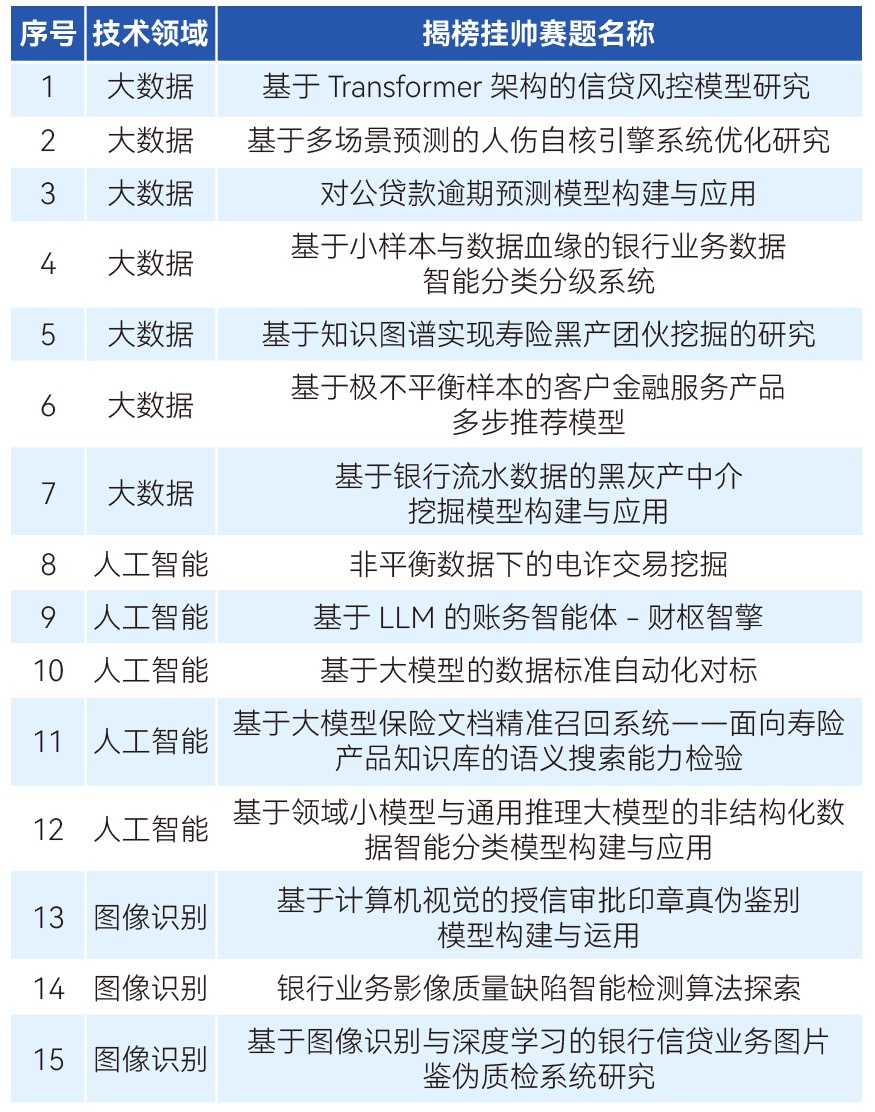 “揭榜掛帥”主賽道圍繞大數據、人工智能與圖像識別 3 大技術領域,共15 個可供揭榜的賽題,賽題列表如下(具體賽題說明詳見《附件 2:第四屆中國研究生金融科技創新大賽“揭榜掛帥”賽題指南》):