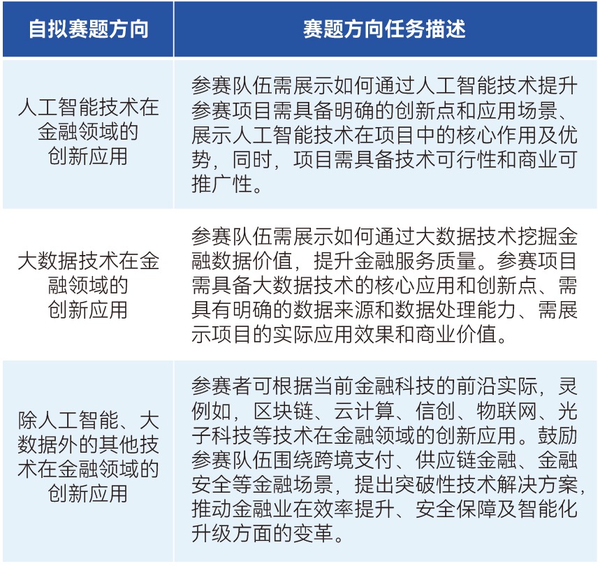 大賽籌備階段,承辦方通過多輪深度溝通對接區域金融創新需求,從30余個企業提案中精選出15個兼具技術創新性、落地可行性與行業應用價值的企業“揭榜掛帥”賽題。同時,保留3個自擬題目方向(原成長賽道),形成兼具創新性與落地潛力的賽題體系, 既對接金融機構實際業務需求,又為高校團隊提供多元化創新空間。 現面向全國研究生公開發布賽題,誠邀各團隊攜創新方案踴躍報名,共赴金融科技攻關實踐。