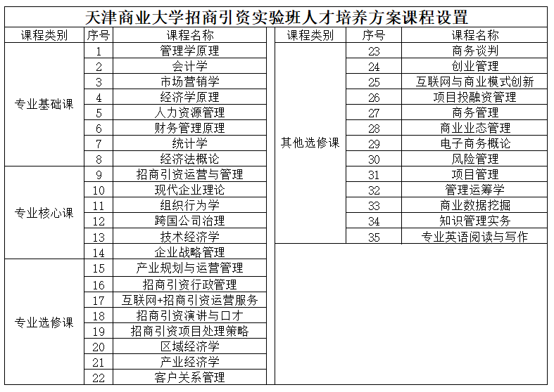 天津商業大學工商管理專業招商引資實驗班的整體教學計劃遵循天津商業大學本科教學計劃設計的基本要求,對工商管理專業必修的各類課程不作改動,同時開設招商引資實務方向課程,并將專業綜合(畢業)實習環節安排為在谷川聯行有限公司進行的綜合實訓。